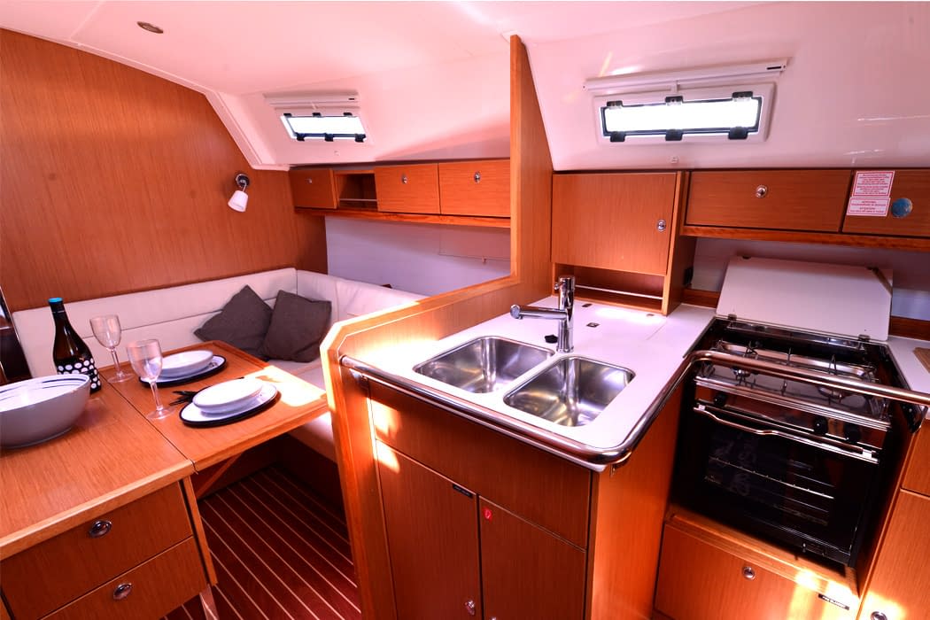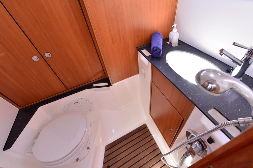 | Outside | Badeplattform, Biminitop, elektr. Ankerwinsch, Faltpropeller, Sprayhood, Teakdeck |