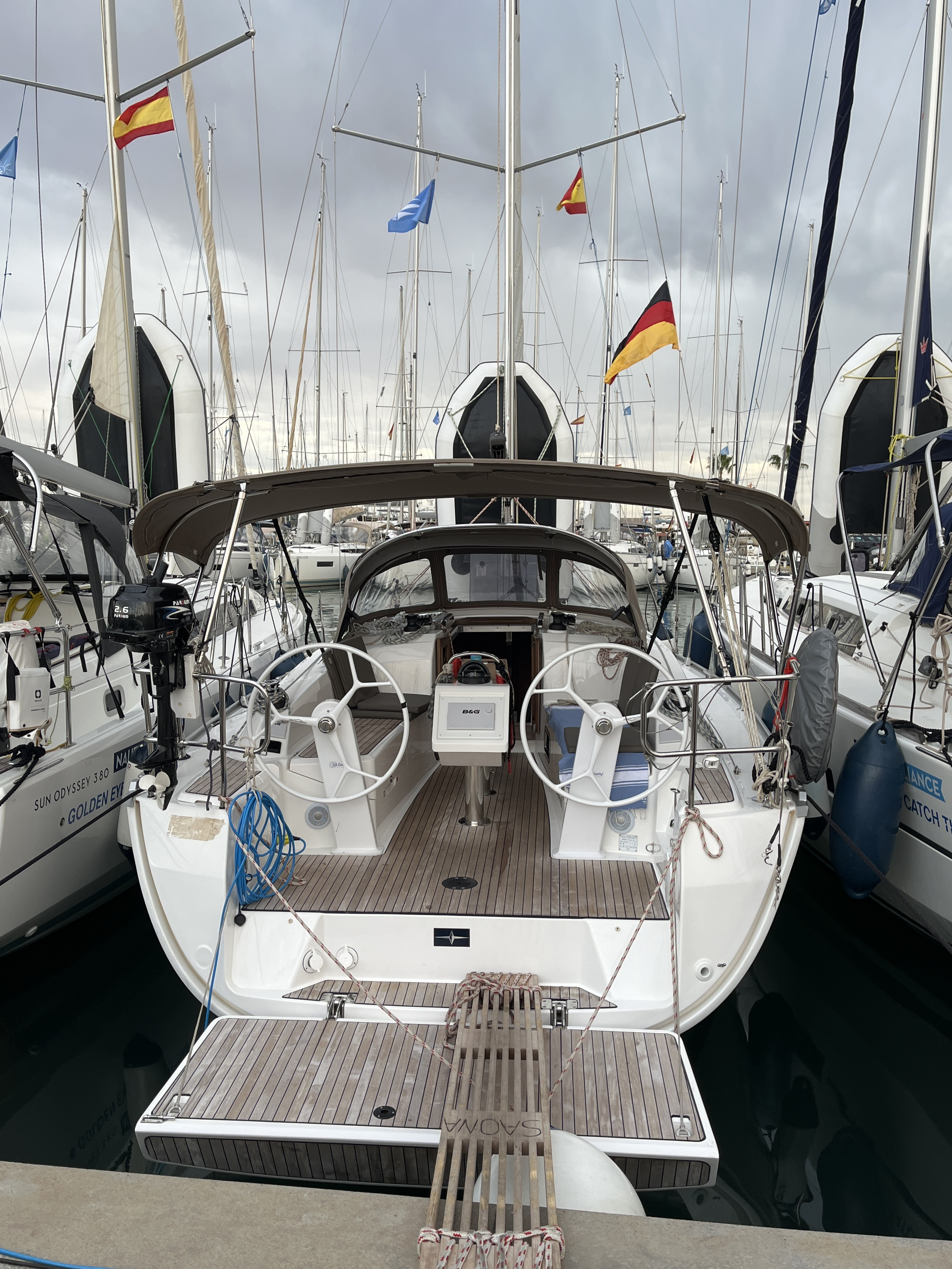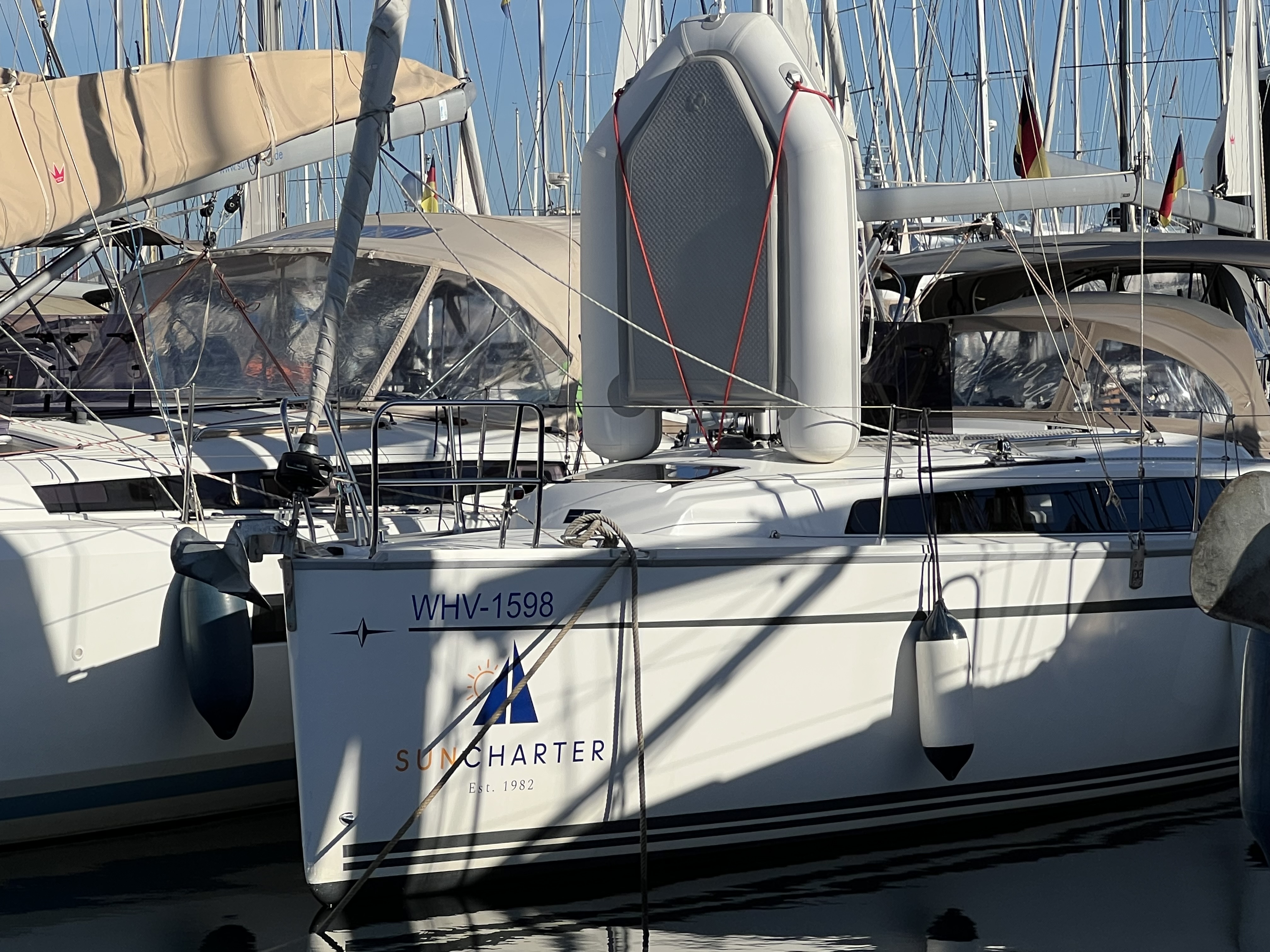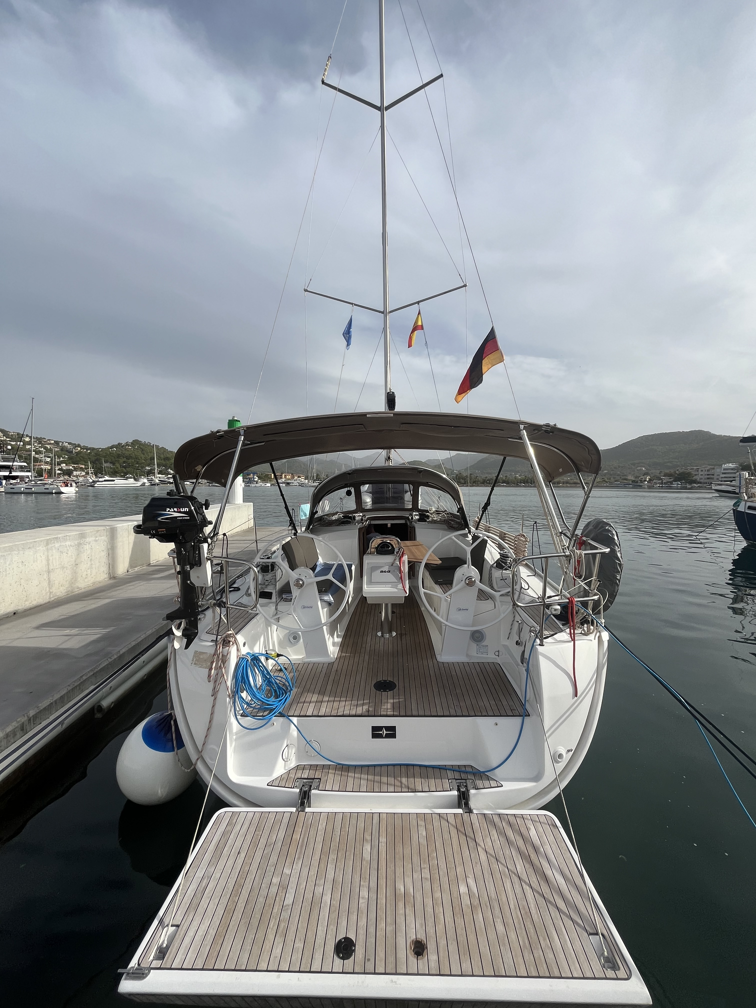 | Outside | 220 V-Landanschluss, Anker mit Kette, Ankerwinsch, Biminitop, Bootshaken, Cockpitdusche, Cockpitlautsprecher, Cockpitpolster, Cockpittisch, elektr. Ankerwinsch, Fender, Festmacherleinen, Gangway, Kugelfender, Kunststoff-Eimer (Pütz), Sprayhood, Teak im Cockpit, Wantenschneider, Wasserschlauch, Windex |
