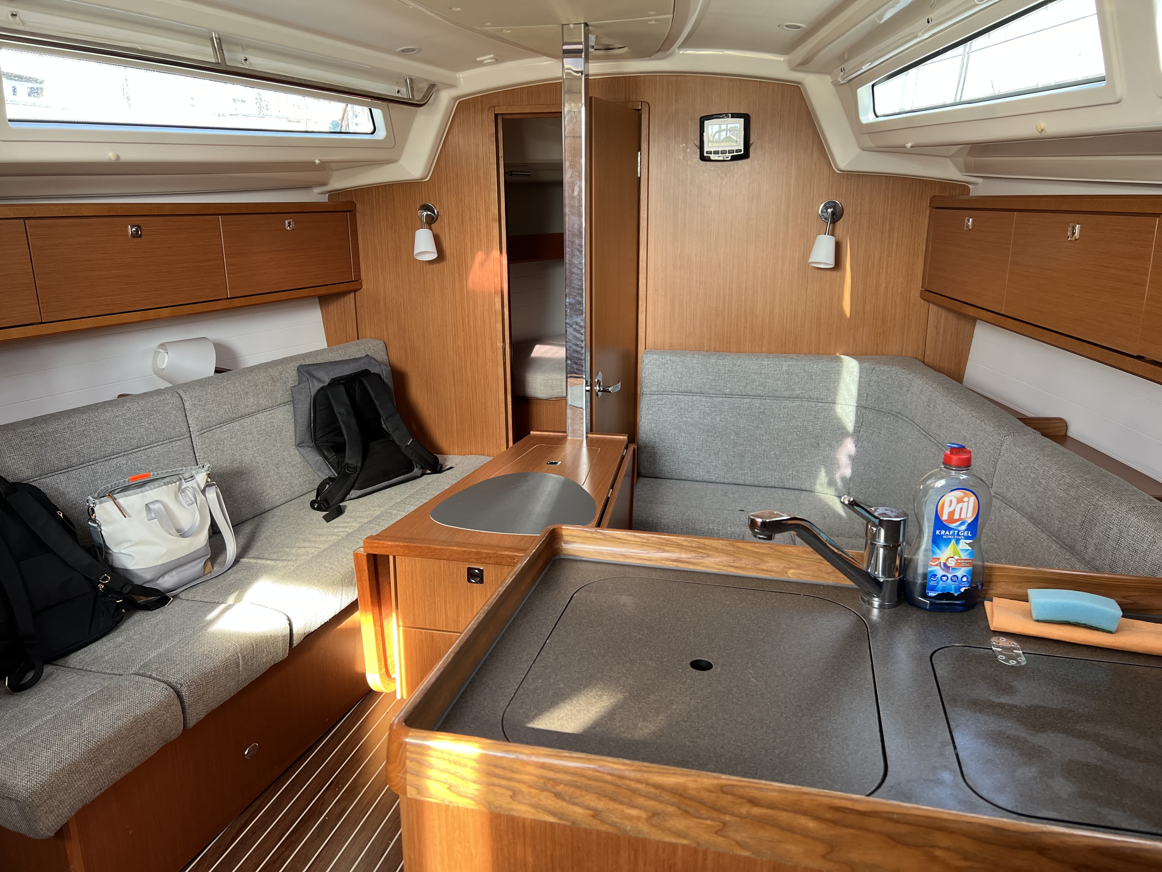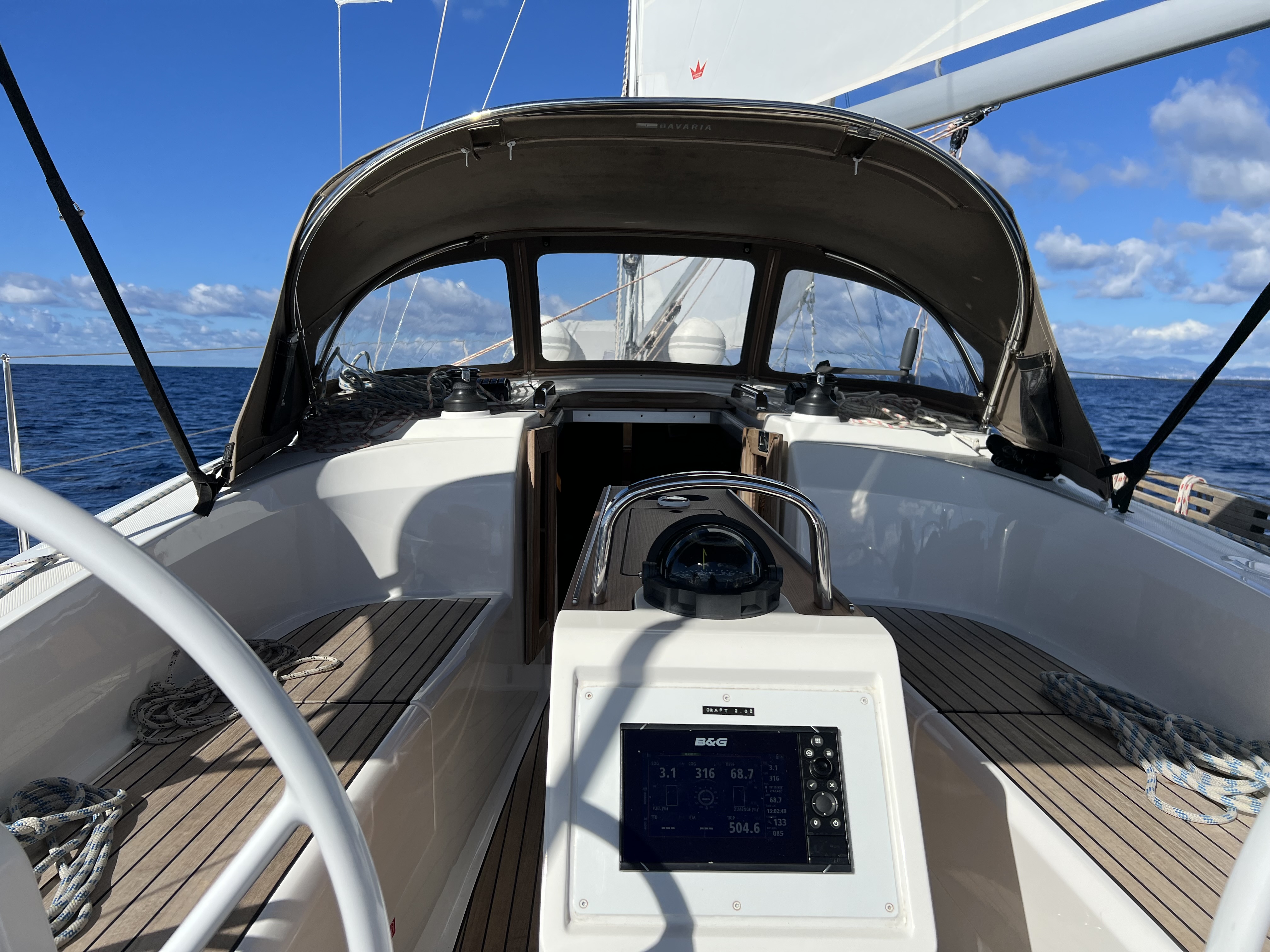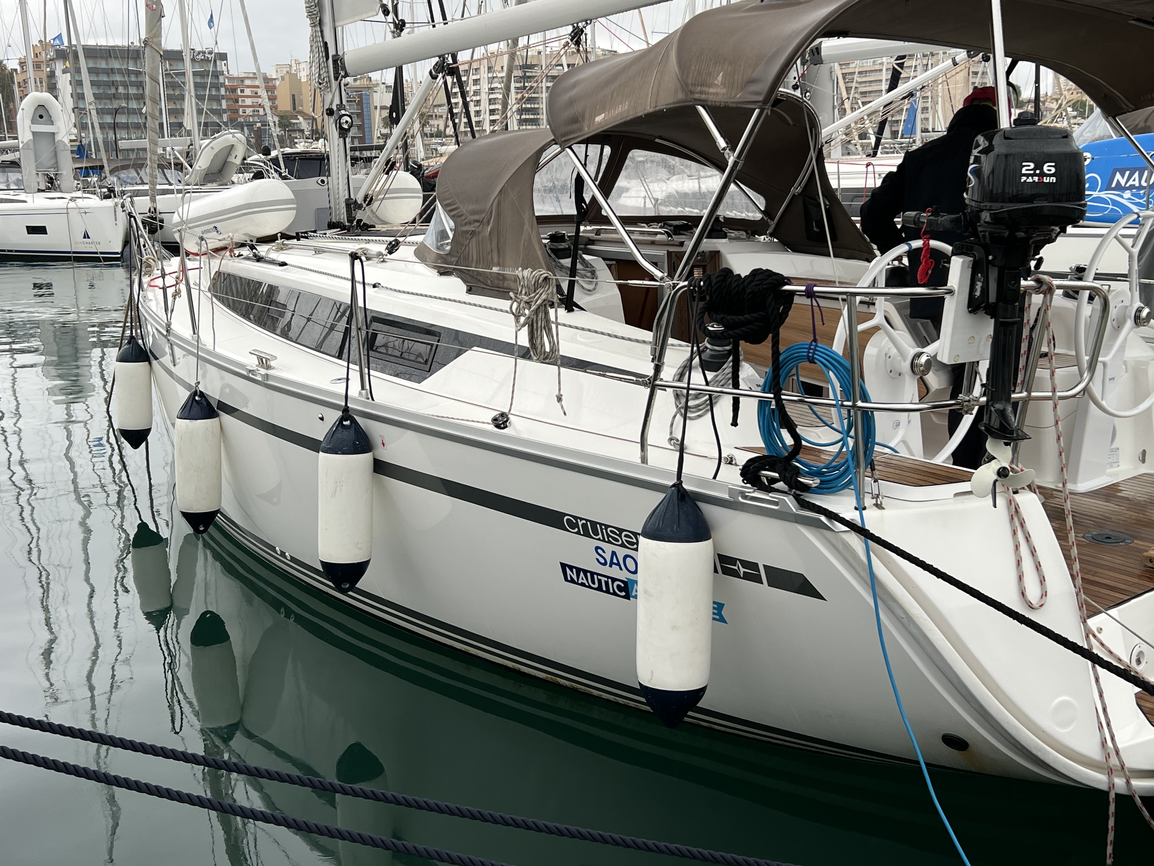 | Outside | 220 V-Landanschluss, Anker mit Kette, Ankerwinsch, Biminitop, Bootshaken, Cockpitdusche, Cockpitlautsprecher, Cockpitpolster, Cockpittisch, elektr. Ankerwinsch, Fender, Festmacherleinen, Gangway, Kugelfender, Kunststoff-Eimer (Pütz), Sprayhood, Teak im Cockpit, Wantenschneider, Wasserschlauch, Windex |