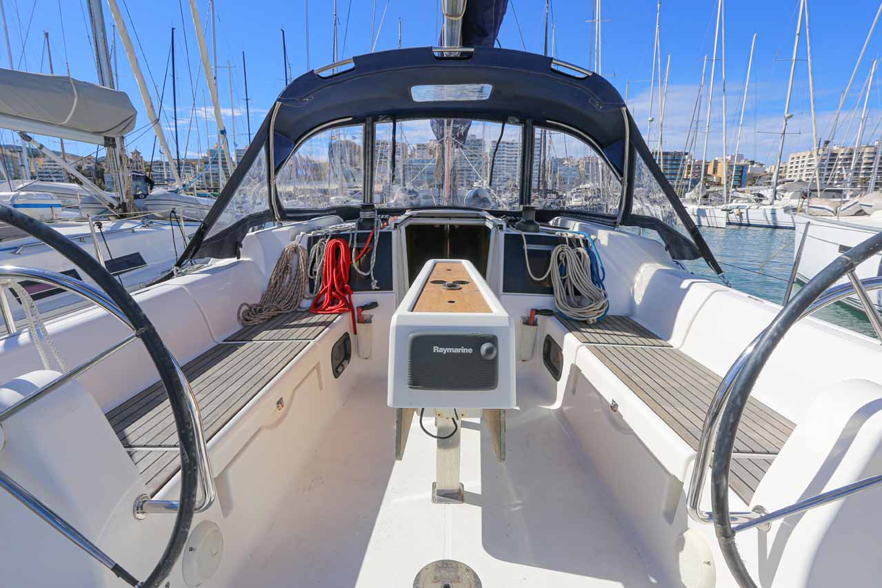 | Outside | 220 V-Landanschluss, Anker mit Kette, Ankerwinsch, Biminitop, Bootshaken, Cockpitdusche, Cockpitlautsprecher, Cockpitpolster, Cockpittisch, elektr. Ankerwinsch, Fender, Festmacherleinen, Gangway, Kugelfender, Kunststoff-Eimer (Pütz), Solaranlage, Sprayhood, Teak im Cockpit, Wantenschneider, Wasserschlauch, Windex |