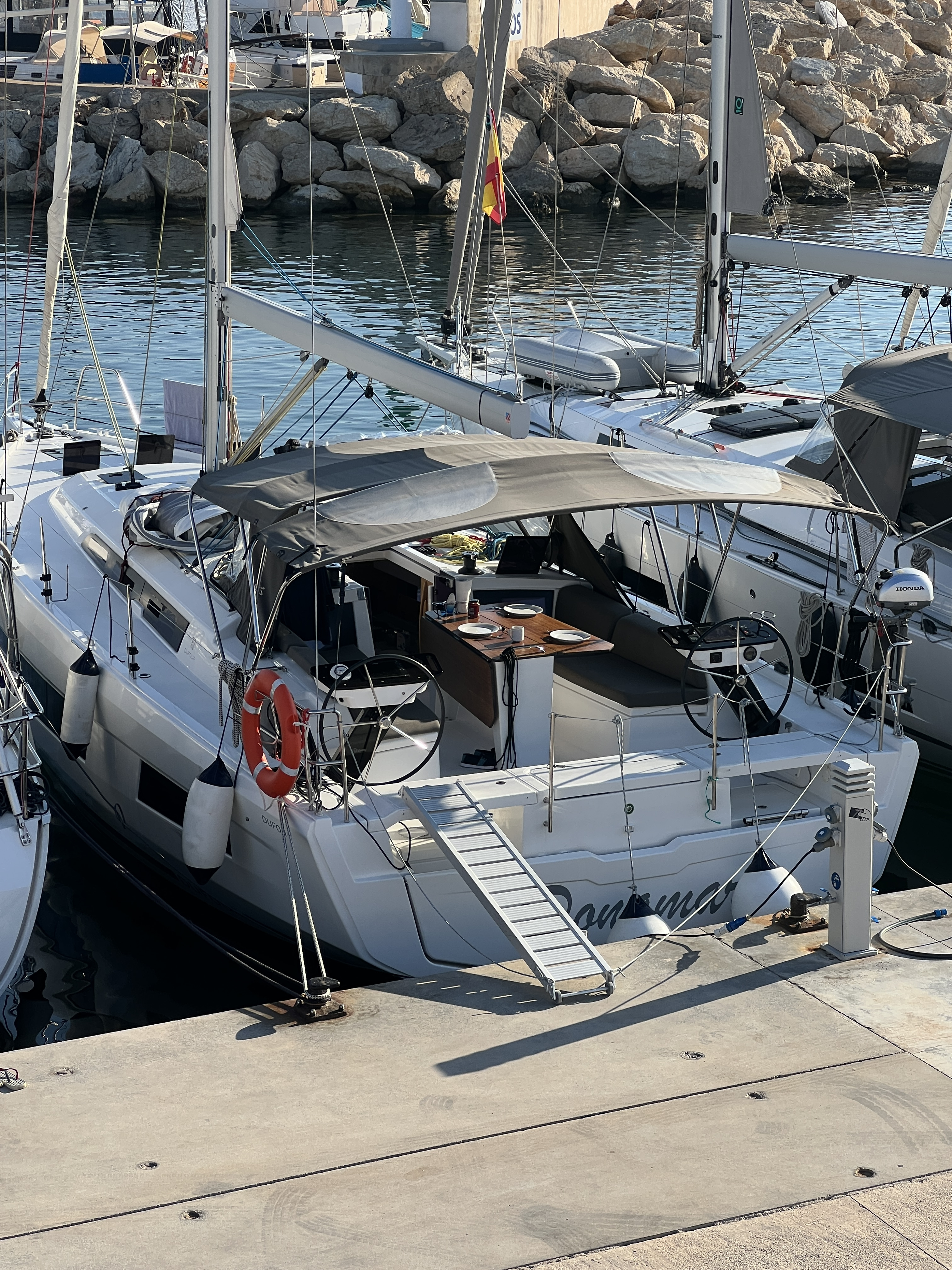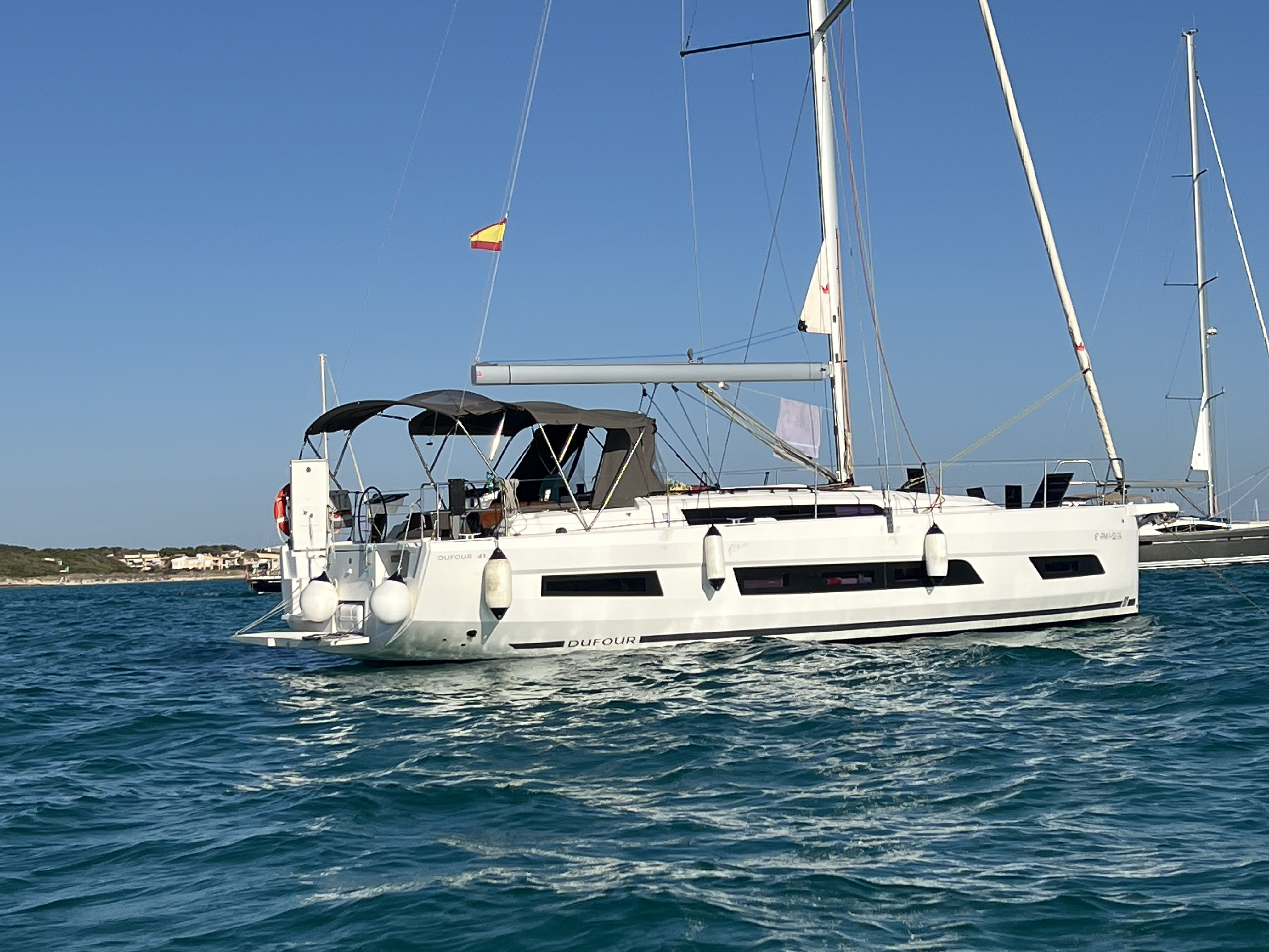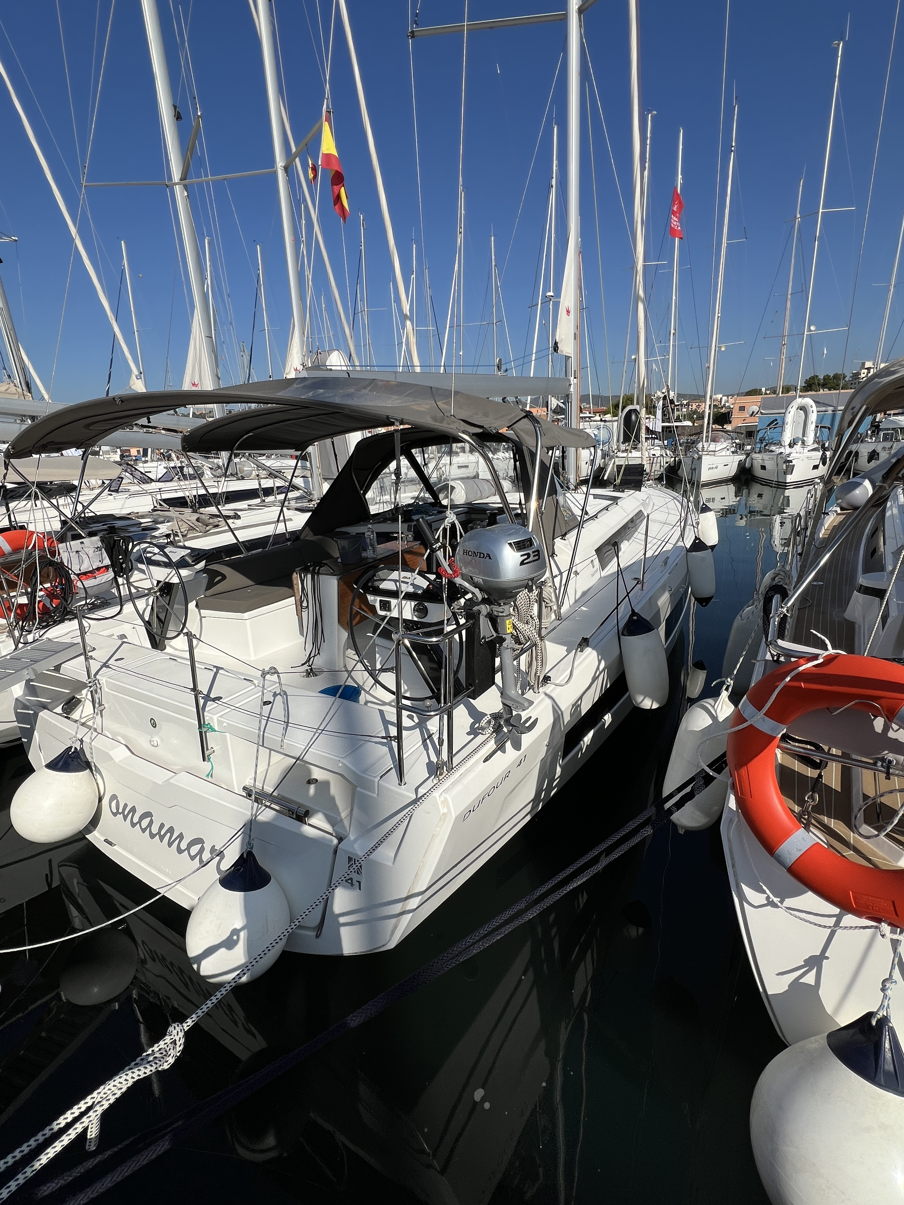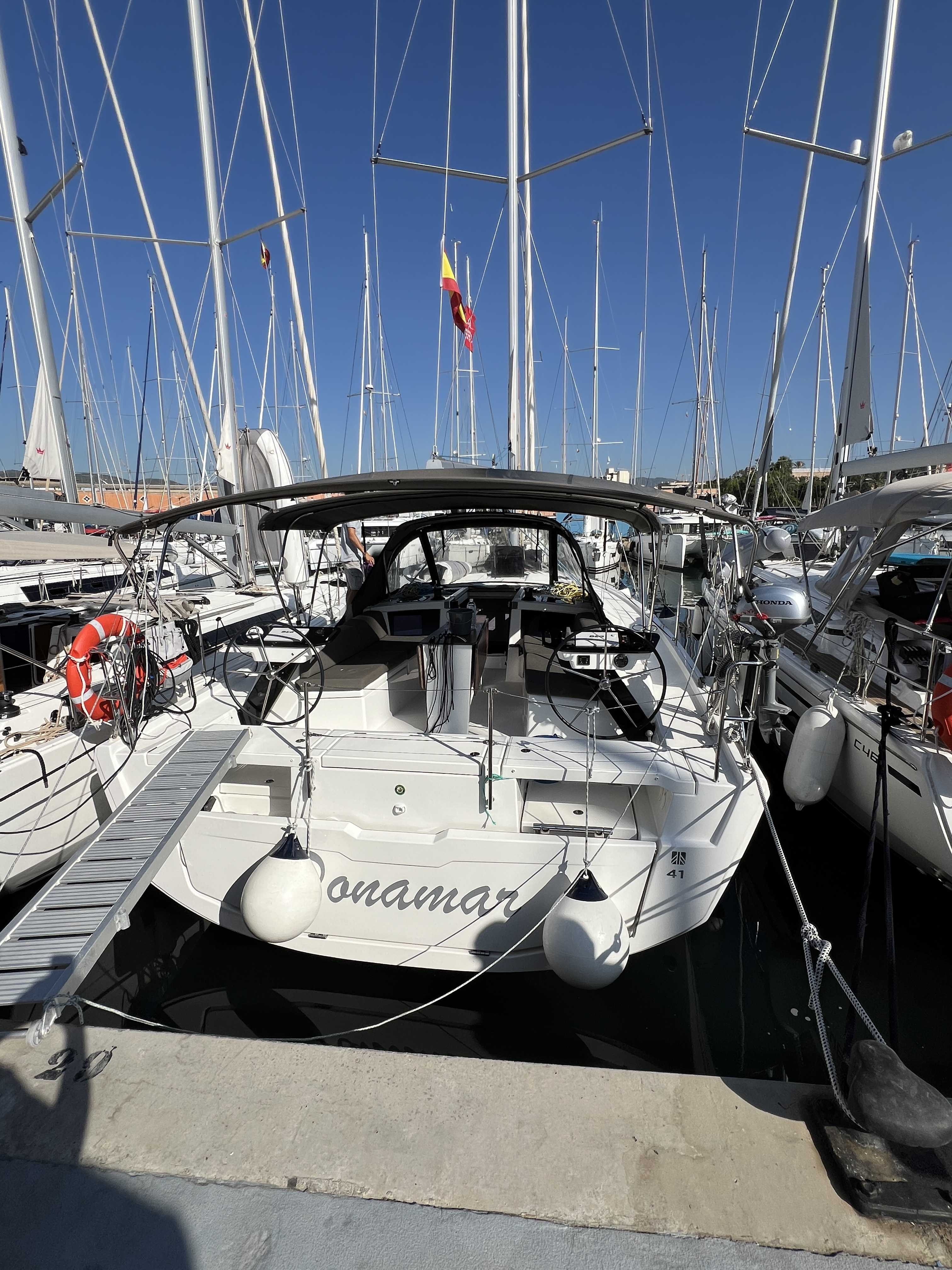 | Outside | Biminitop, Cockpitpolster, Cockpittisch, elektr. Ankerwinsch, Fender, Festmacherleinen, Gangway, Grill, Heckdusche, Lifeline System, Solaranlage, Sprayhood, Wet Bar |