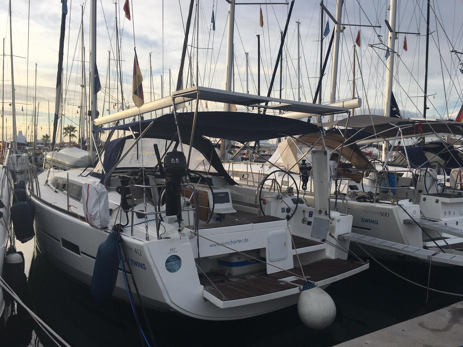 | Outside | 220 V-Landanschluss, Anker mit Kette, Ankerwinsch, Biminitop, Bootshaken, Cockpitdusche, Cockpitlautsprecher, Cockpitpolster, Cockpittisch, elektr. Ankerwinsch, Fender, Festmacherleinen, Gangway, Kugelfender, Kunststoff-Eimer (Pütz), Lifeline System, Solaranlage, Sprayhood, Teak im Cockpit, Wantenschneider, Wasserschlauch, Windex |