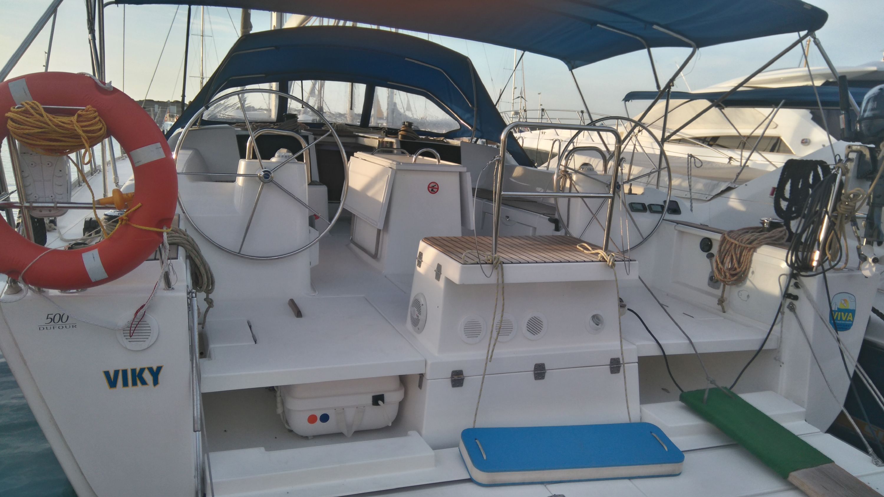 | Outside | 220 V-Landanschluss, Anker mit Kette, Biminitop, Bootshaken, Cockpitpolster, Deckbürste, Fender, Gangway, Sprayhood, Wantenschneider, Winschen |