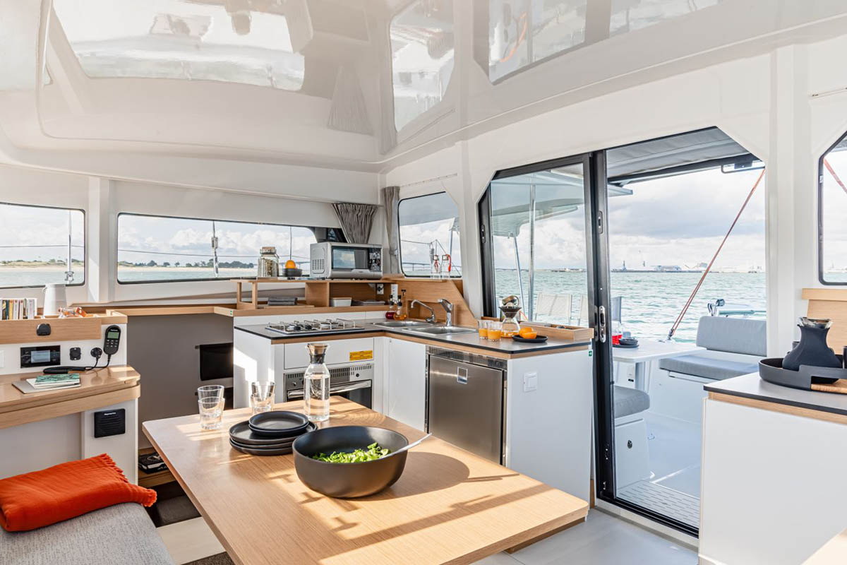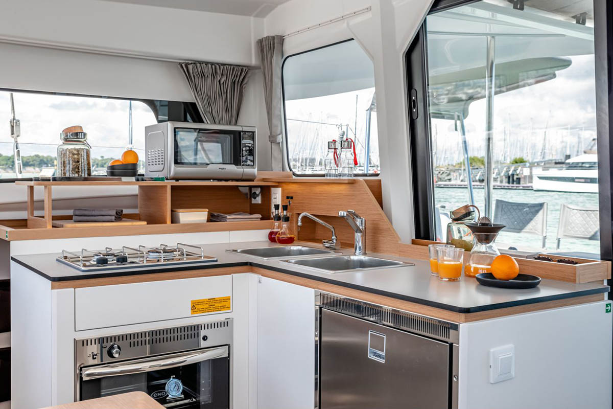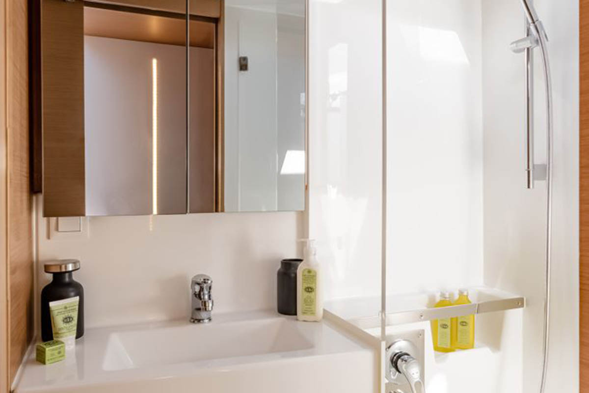 | Inside | Frischwasserpumpe, FUSION Sound System, Gefrierschrank, Geschirr, Hi-Fi System, Inverter 12V/220V, Kühlschrank, Lautsprecher in Salon und Cockpit, Mixer, Pantryausstattung, Ventilatoren in Salon und Kabinen, WC (elektr.) |