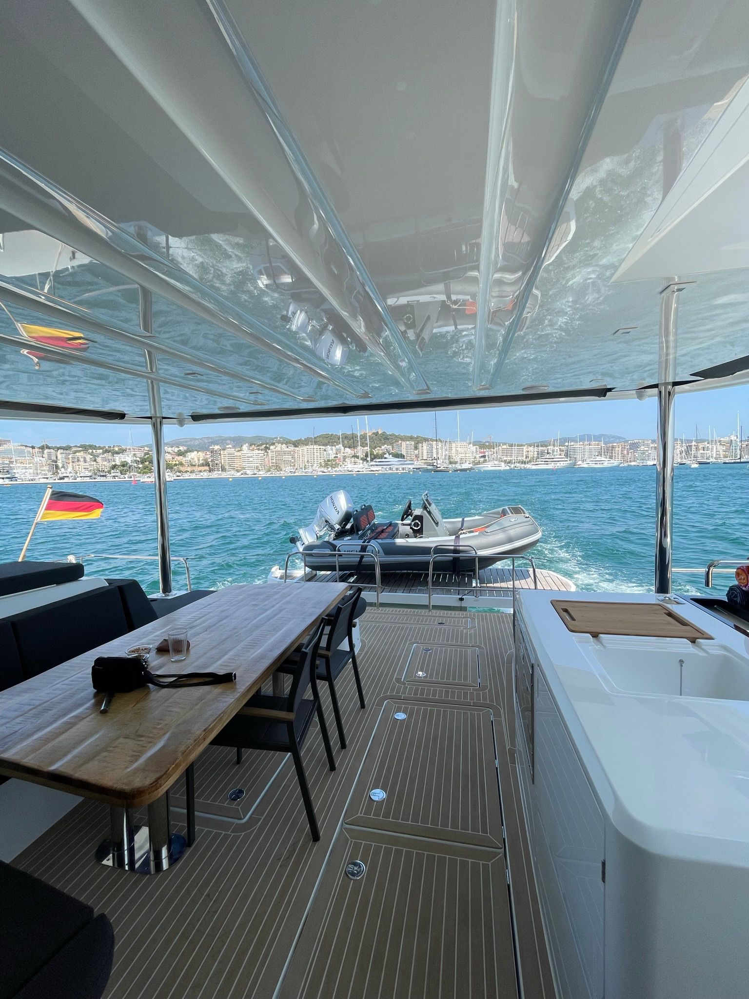 | Outside | Badeleiter, Badeplattform, Cockpitdusche warm/kalt, Cockpittisch, Deckpolster, elektr. Winsch, Fender, Gangway, Hardtop, Teakdeck, Unterwasserbeleuchtung |