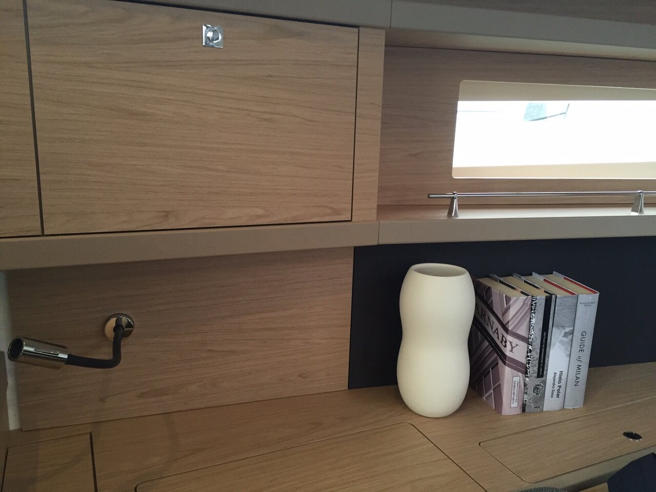 | Safety | AIS Empfänger, Autopilot, Bilgepumpe, Bordapotheke, Bordwerkzeug, Bugstrahlruder, elektr. Bilgepumpe, Epirb, Feststoffschwimmwesten, Handbilgepumpe, Leuchtboje, Navigationslichter, Notpinne, Notsignale, Rettungsinsel, Rettungskragen, Sicherheitsausrüstung, Sicherheitsgurt, Taschenlampe, UKW-Funk, Zweitanker |