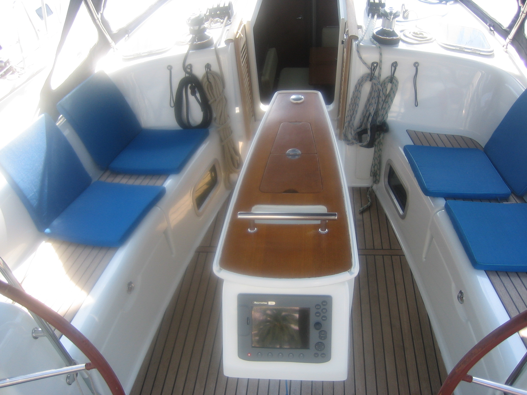 Outside 220 V-Landanschluss, Biminitop, Cockpitdusche, Cockpittisch, elektr. Ankerwinsch, Festmacherleinen, Solaranlage, Sprayhood