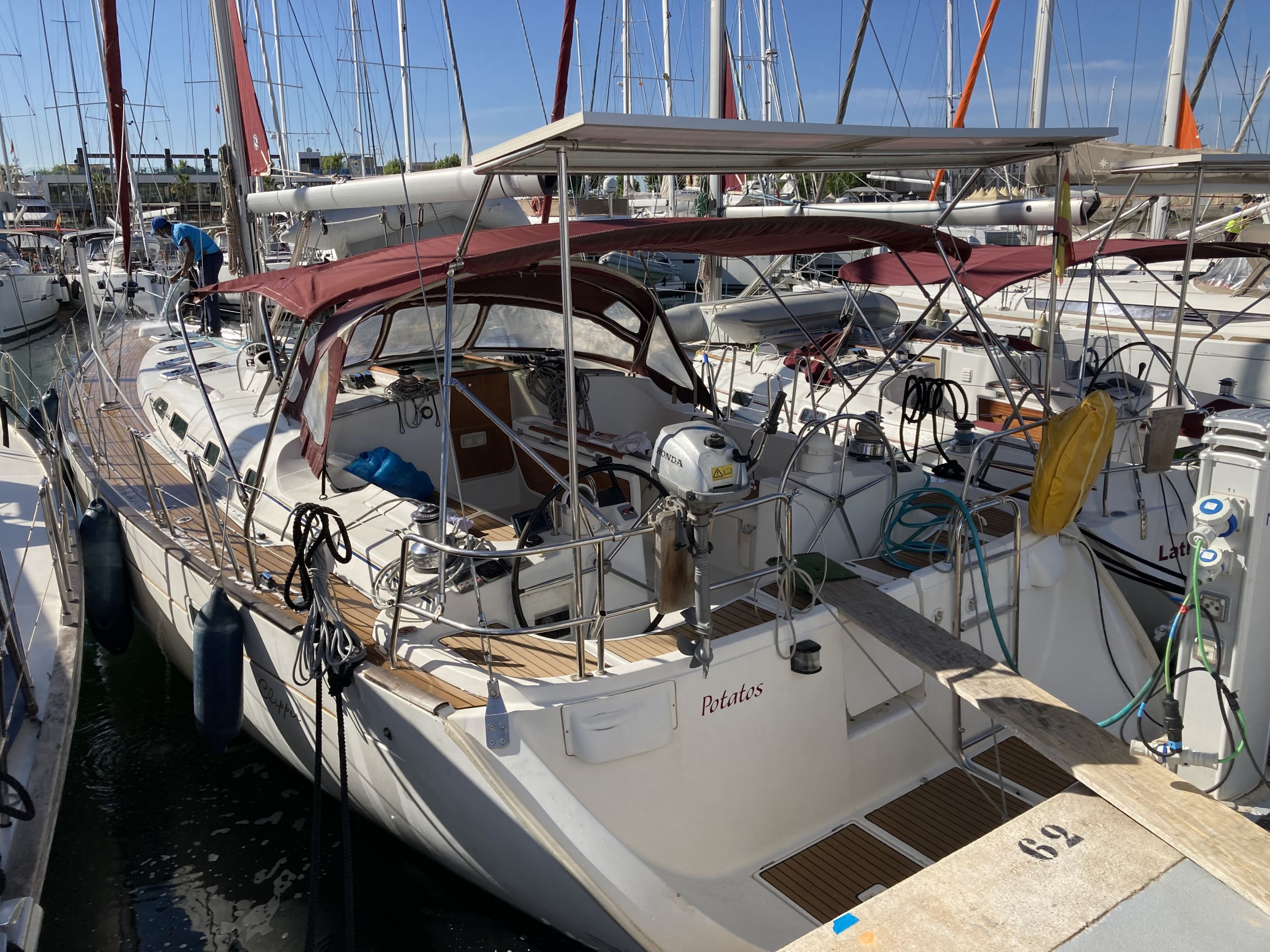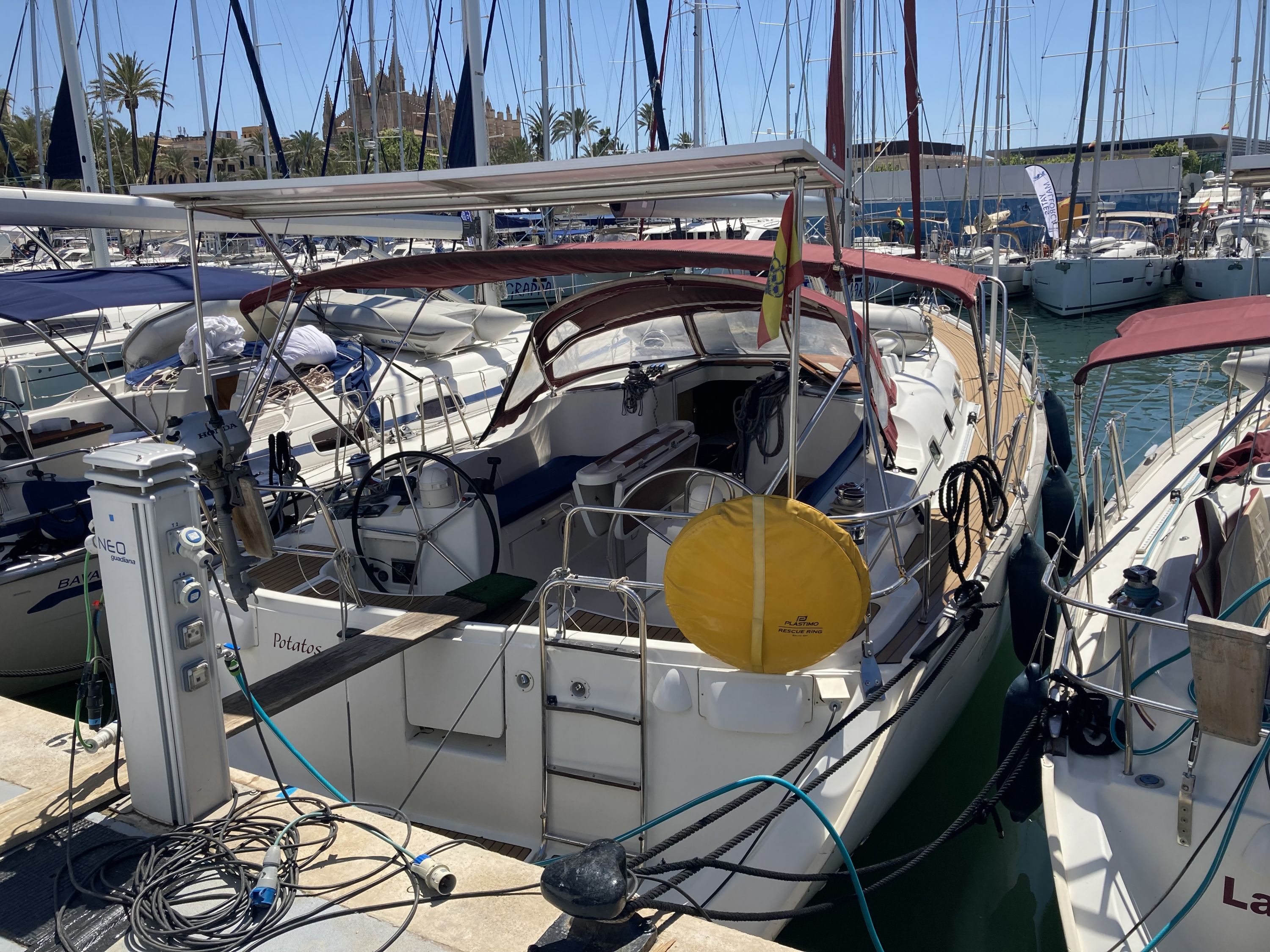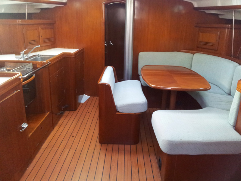 | Outside | 220 V-Landanschluss, Anker mit Kette, Aschenbecher, Badeleiter, Biminitop, Bootshaken, Cockpitdusche, Cockpitpolster, Cockpittisch, Deckbürste, Dieselkanister , elektr. Ankerwinsch, Fallwinschen, Fender, Festmacherleinen, Kunststoff-Eimer (Pütz), Solaranlage, Sprayhood, Teakdeck, Wasserschlauch, Winschen |