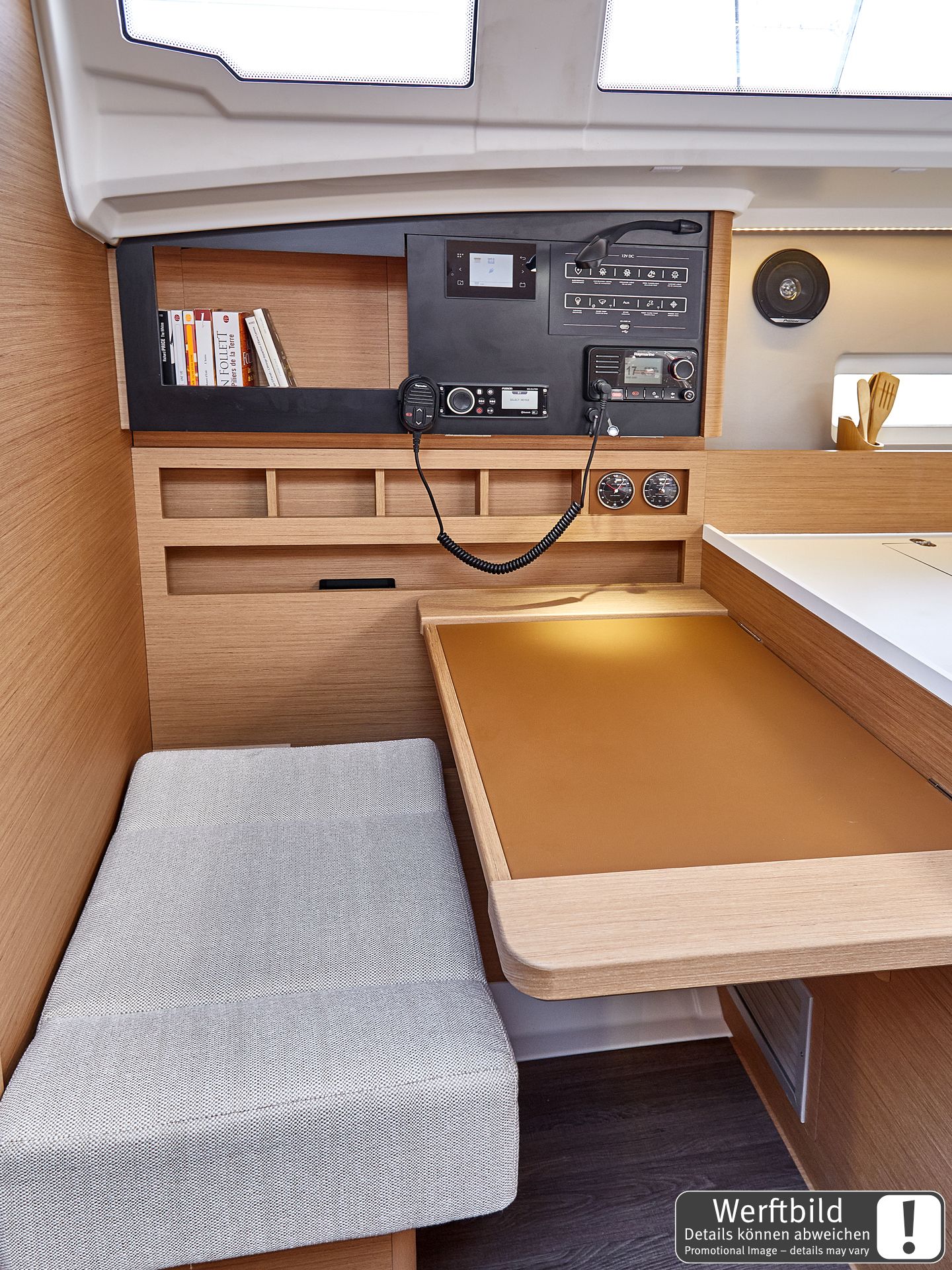 | Safety | AIS Empfänger, Ankerlicht, Automatikwesten, Autopilot, Bootsmannstuhl, Bugstrahlruder, elektr. Bilgepumpe, Flaggen, Navigationslichter, Notpinne, UKW-Funk, Zweitanker |