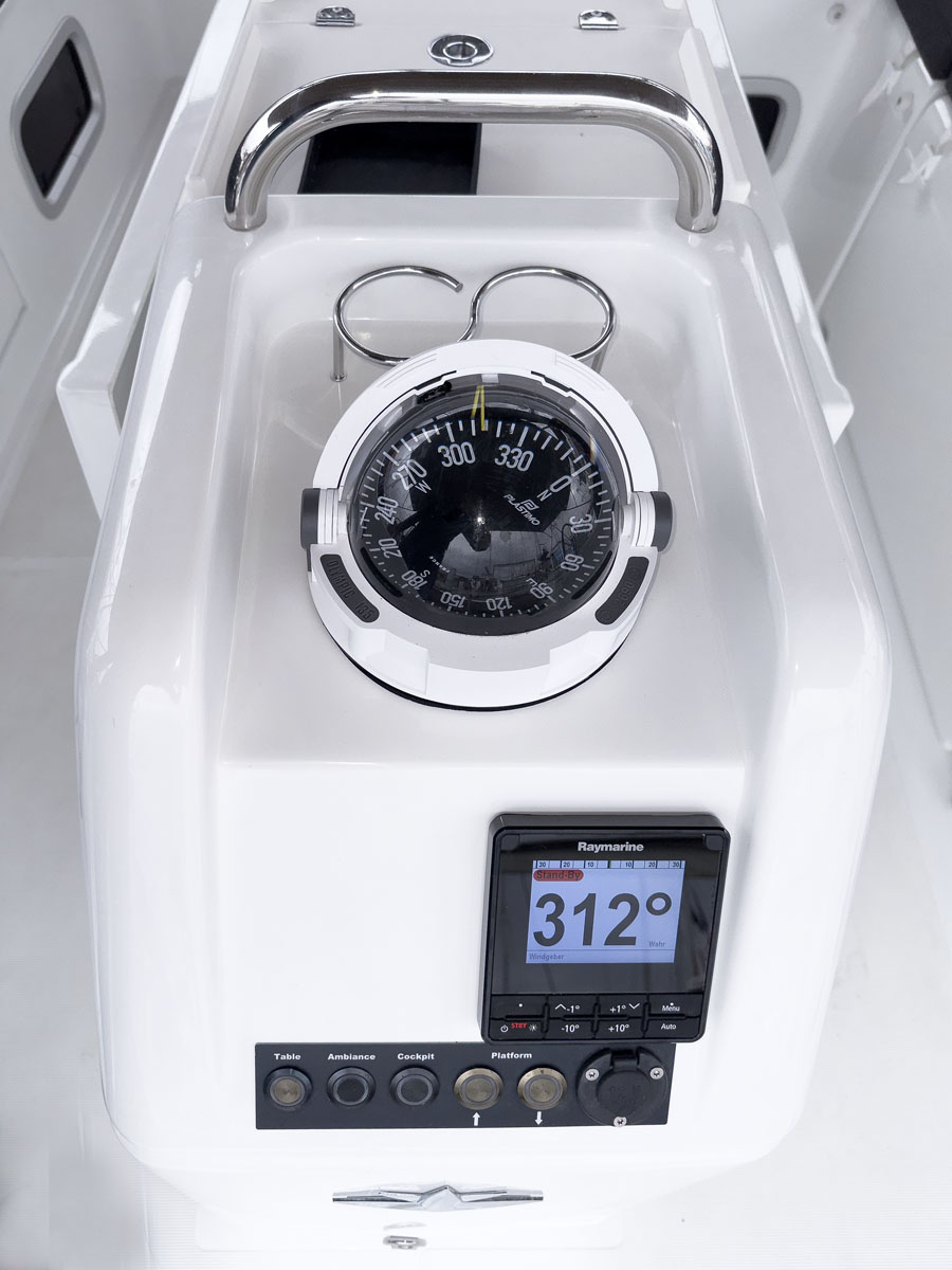 | Outside | Badeplattform (hydr.), Biminitop, Cockpitlautsprecher, Cockpitpolster, Cockpittisch (klappbar), elektr. Ankerwinsch, elektr. Winsch, Fender, Sprayhood |