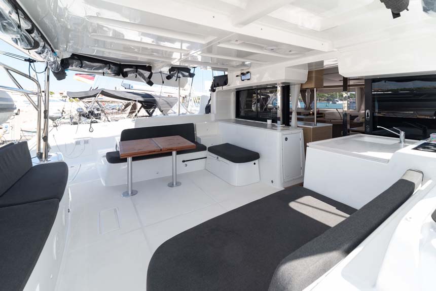 | Outside | Biminitop, Cockpitkühlschrank, Cockpitlautsprecher, Cockpitpolster, Cockpittisch (klappbar), Deckpolster, elektr. Flatwinder, Fernsteuerung für elektr. Ankerwinsch, Flybridge, Solaranlage |
