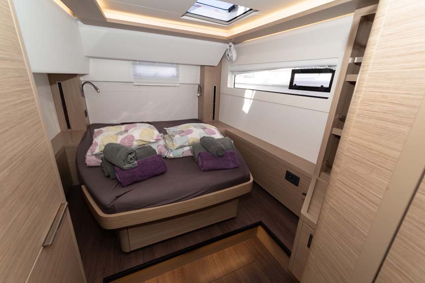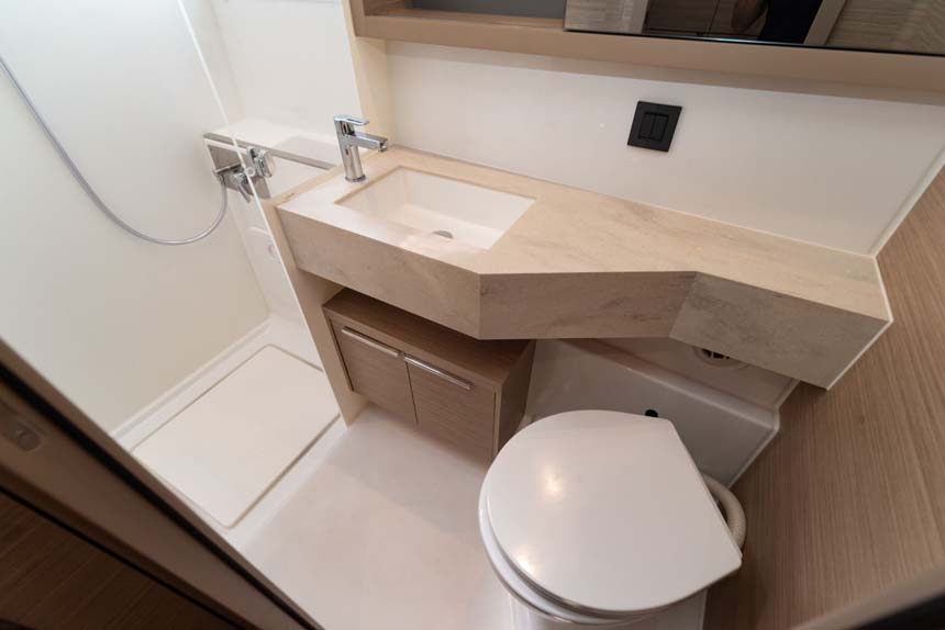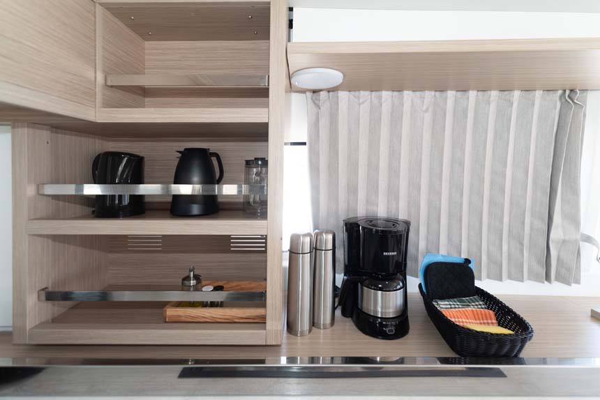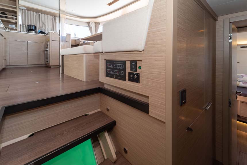 | Inside | Gefrierschrank, Generator, Heizung, Inverter 12V/220V, Klimaanlage (Landstrom), Kühlschrank, Lautsprecher im Salon, Salontisch absenkbar, TV, Ventilatoren in Kabinen, Watermaker, WC (elektr.) |