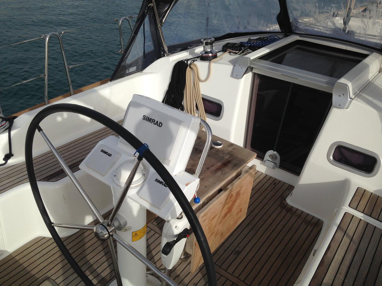 | Outside | 220 V-Landanschluss, Badeleiter, Biminitop, Cockpitdusche warm/kalt, Cockpitlautsprecher, Cockpitpolster, Cockpittisch, elektr. Ankerwinsch, Gangway, Sonnensegel, Sprayhood, Teak im Cockpit, Windex |