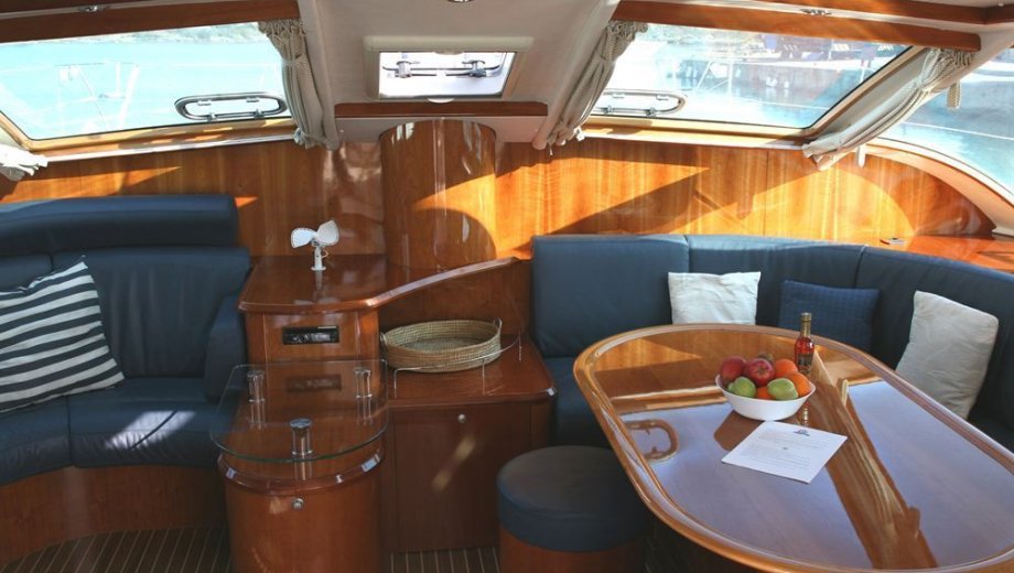 | Outside | 220 V-Landanschluss, Anker mit Kette, Badeleiter, Biminitop, Cockpitdusche warm/kalt, Cockpitlautsprecher, Cockpittisch, elektr. Ankerwinsch, elektr. Winsch, Faltpropeller, Gangway, Solaranlage, Sprayhood, Teak im Cockpit, Treibanker, Windex |