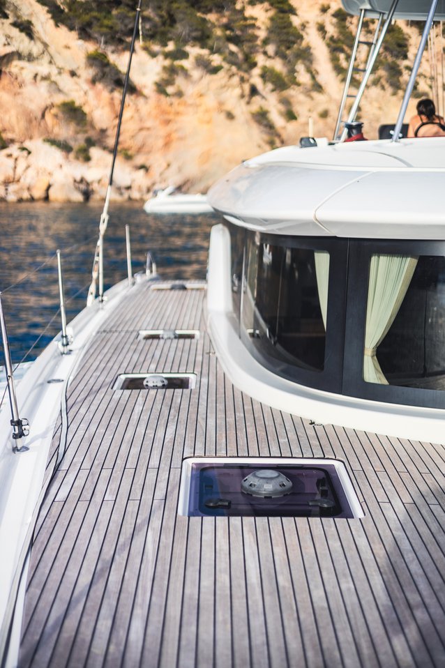 | Outside | Ankerkettenzähler, Badeplattform (hydr.), Cockpitlautsprecher, elektr. Winsch, Flybridge, Schnorchelausrüstung, Solaranlage, Teak im Cockpit, Teakdeck |