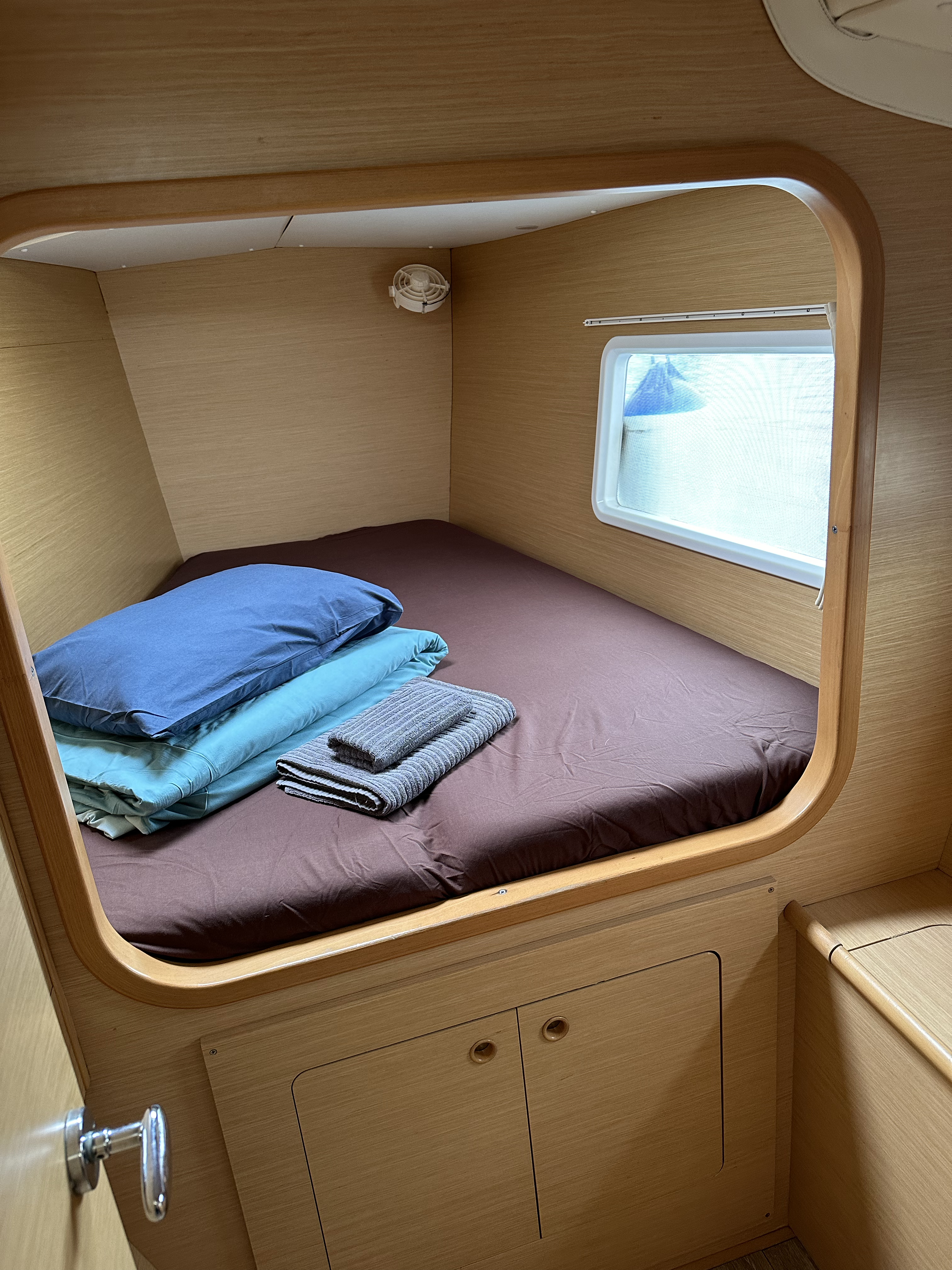 | Safety | AIS Empfänger, Autopilot, Bootsmannstuhl, Bordapotheke, Bordwerkzeug, elektr. Bilgepumpe, Epirb, Feststoffschwimmwesten, Feuerlöscher, GMDSS, Leuchtboje, Lifebelts, Navigationslichter, Nebelhorn, Notpinne, Radarreflektor, Rettungsinsel, Rettungskragen, Taschenlampe, UKW-Funk |