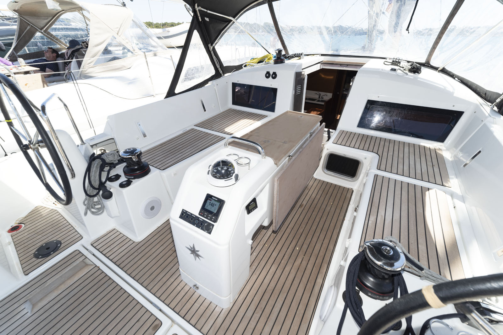 | Outside | Badeplattform (hydr.), Biminitop, Cockpitlautsprecher, Cockpitpolster, Cockpittisch (klappbar), elektr. Ankerwinsch, elektr. Winsch, Fender, Sprayhood, Teakdeck |