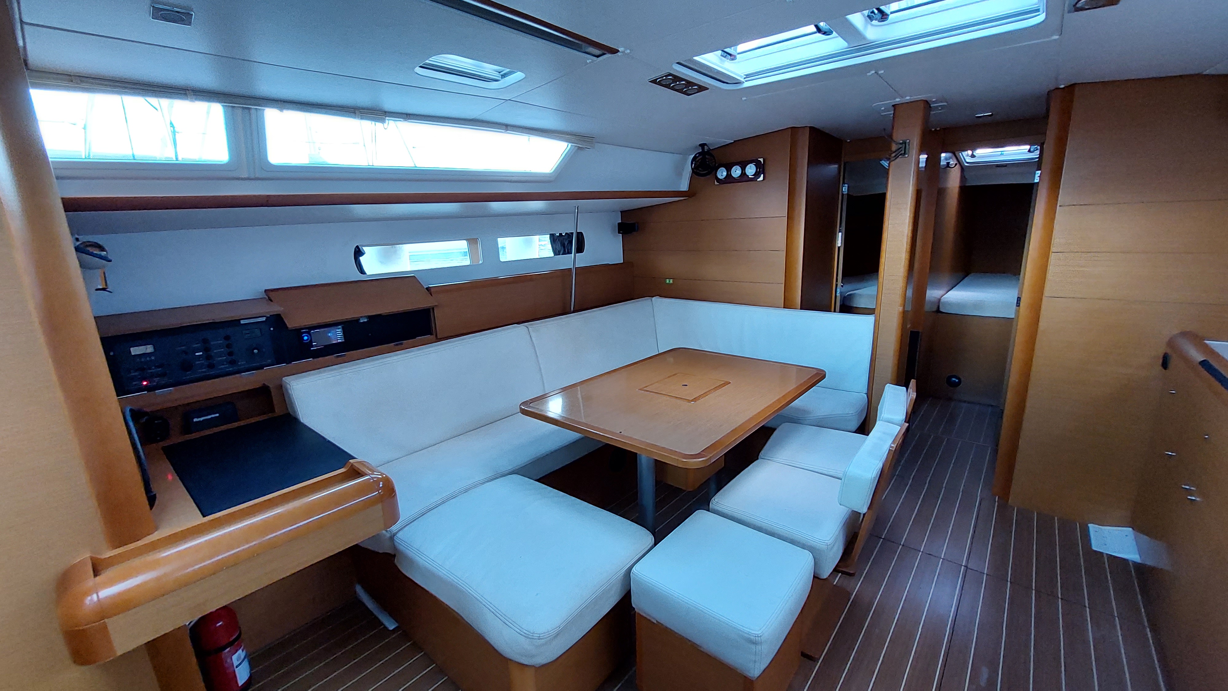 | Outside | 12 V-Anschluss, 220 V-Landanschluss, Anker mit Kette, Badeleiter, Badeplattform, Biminitop, Cockpitdusche, Cockpitlautsprecher, Cockpittisch, Fender, Festmacherleinen, Solaranlage, Sprayhood, Teak im Cockpit, Teakdeck, Wasserschlauch, Windex |