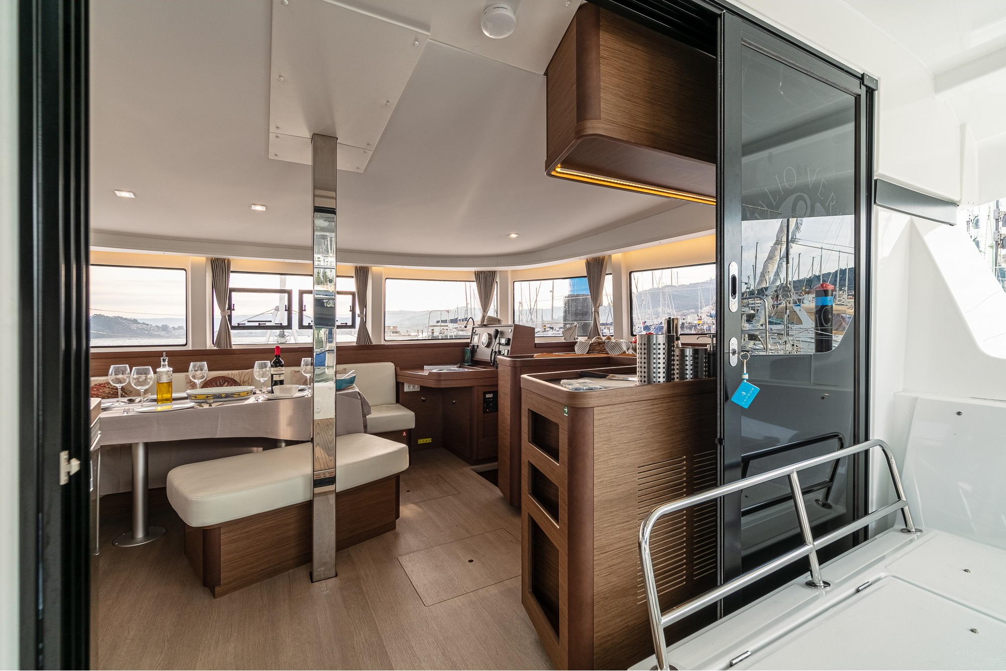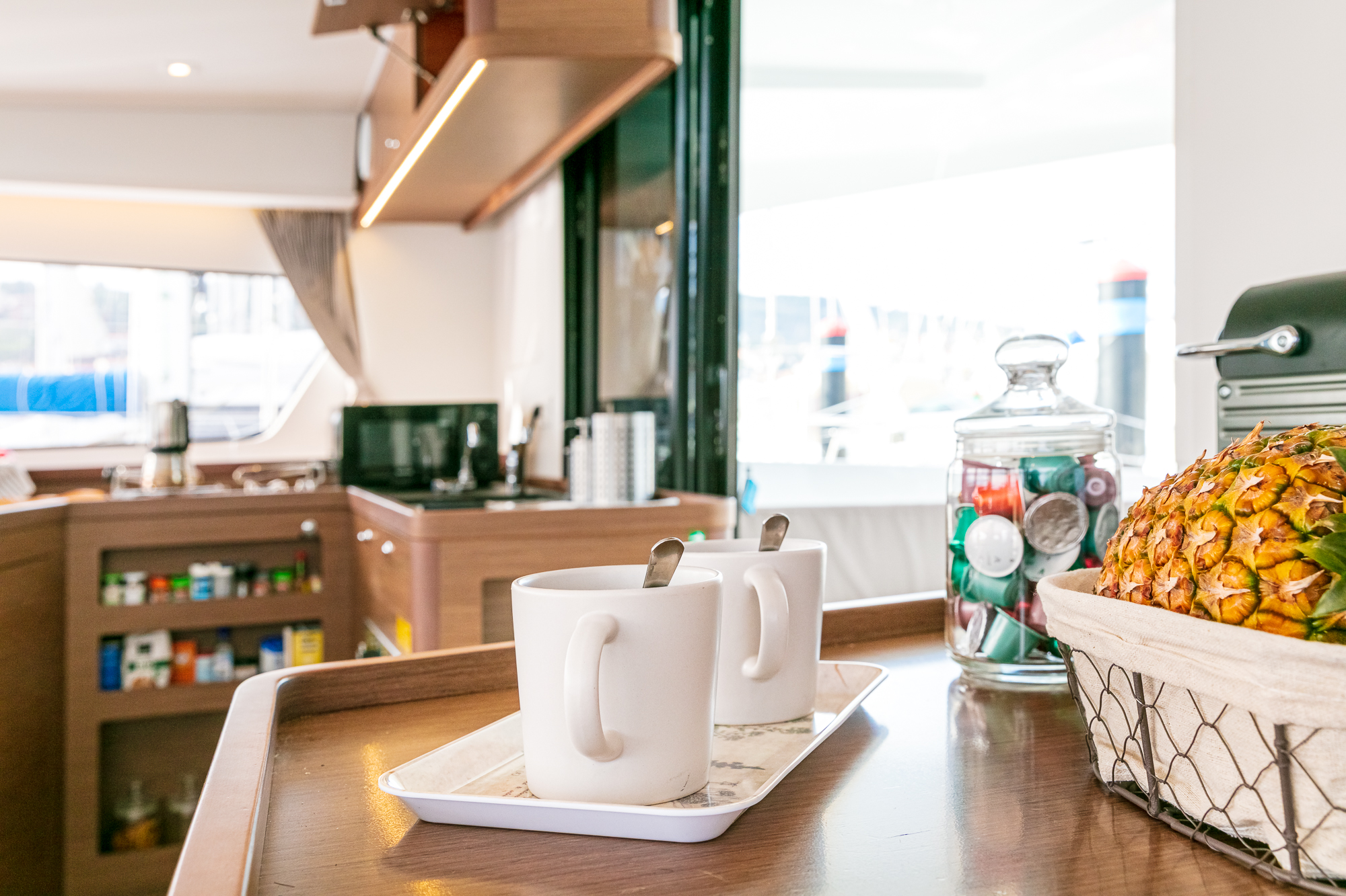 | Outside | 220 V-Landanschluss, Badeleiter, Badeplattform, Biminitop, Cockpitdusche, Cockpitlautsprecher, Cockpittisch, elektr. Ankerwinsch, elektr. Winsch, Schnorchelausrüstung, Sprayhood, Teakdeck |