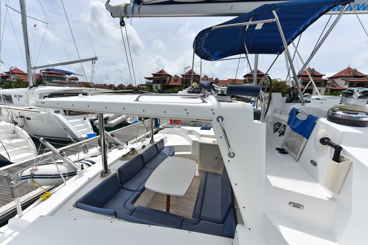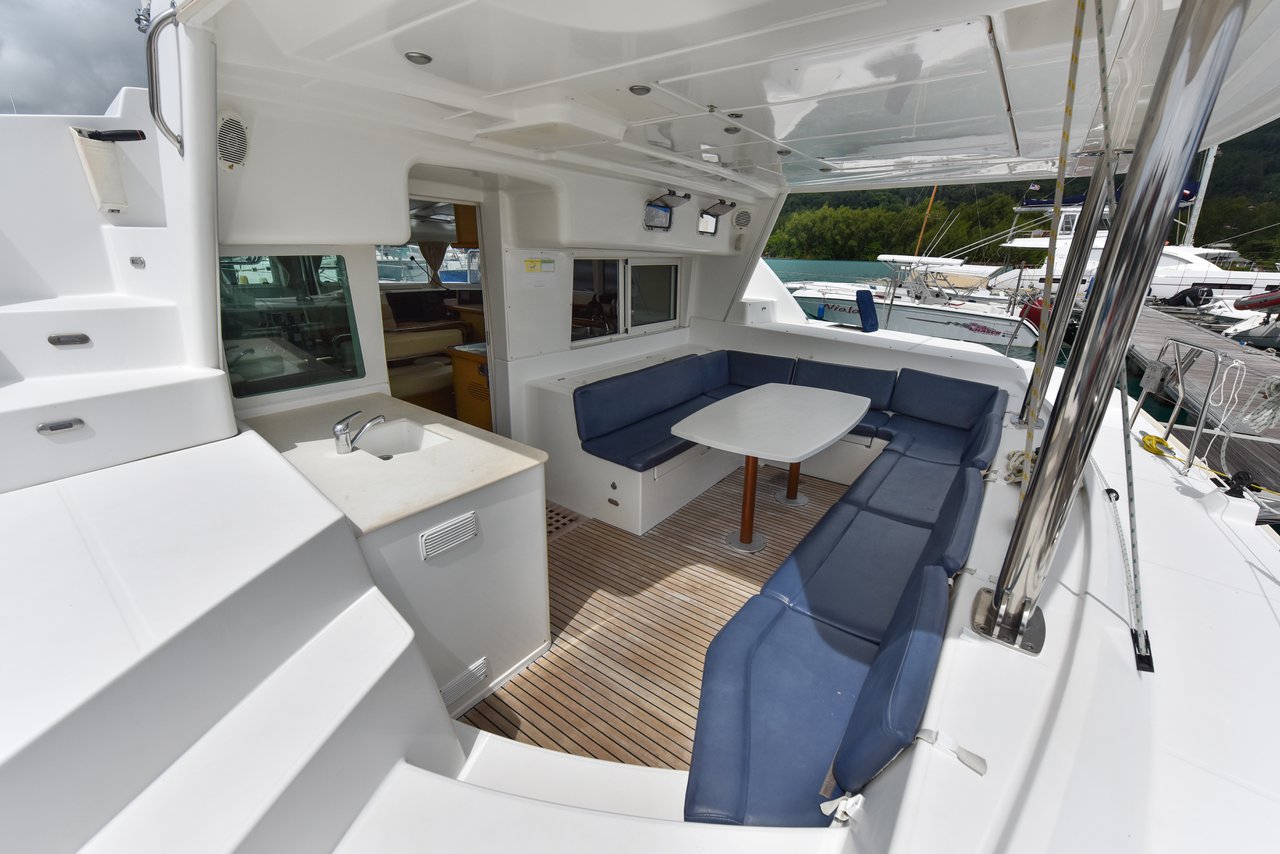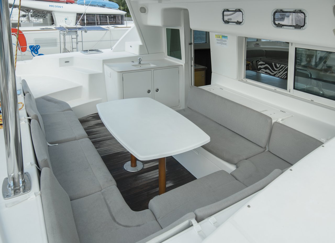 | Outside | Biminitop, Cockpitdusche, Cockpitlautsprecher, Cockpitpolster, Davits, elektr. Winsch, Schnorchelausrüstung, Teak im Cockpit |