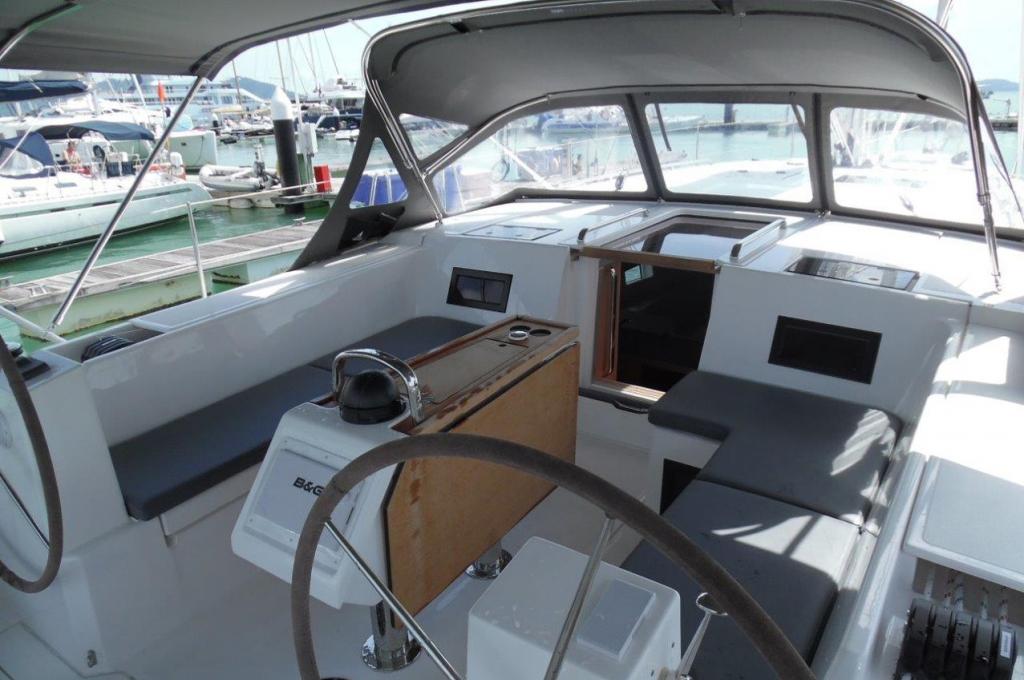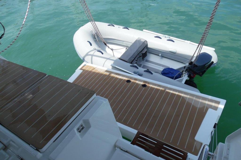 | Outside | Anker mit Kette, Badeleiter, Badeplattform, Biminitop, Bootshaken, Cockpitdusche, Cockpitpolster, Cockpittisch, Davits, Deckbürste, elektr. Ankerwinsch, Fender, Festmacherleinen, Kunststoff-Eimer (Pütz), Schnorchelausrüstung, Solaranlage, Winschen |