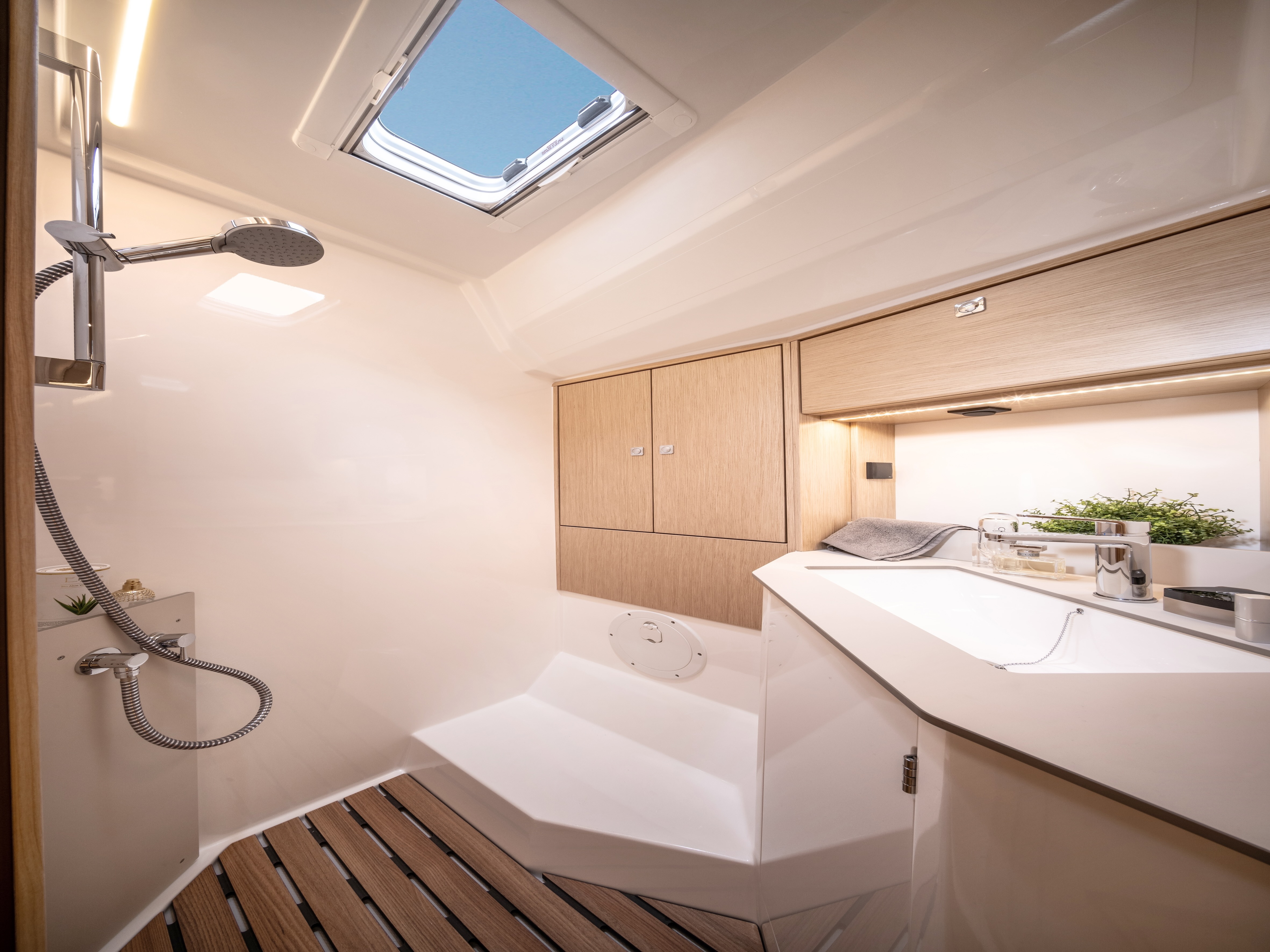 | Outside | Anker mit Kette, Badeleiter, Badeplattform, Biminitop, Bootshaken, Cockpitdusche, Cockpitpolster, Cockpittisch, Davits, Deckbürste, elektr. Ankerwinsch, Fender, Festmacherleinen, Kunststoff-Eimer (Pütz), Schnorchelausrüstung, Solaranlage, Winschen |