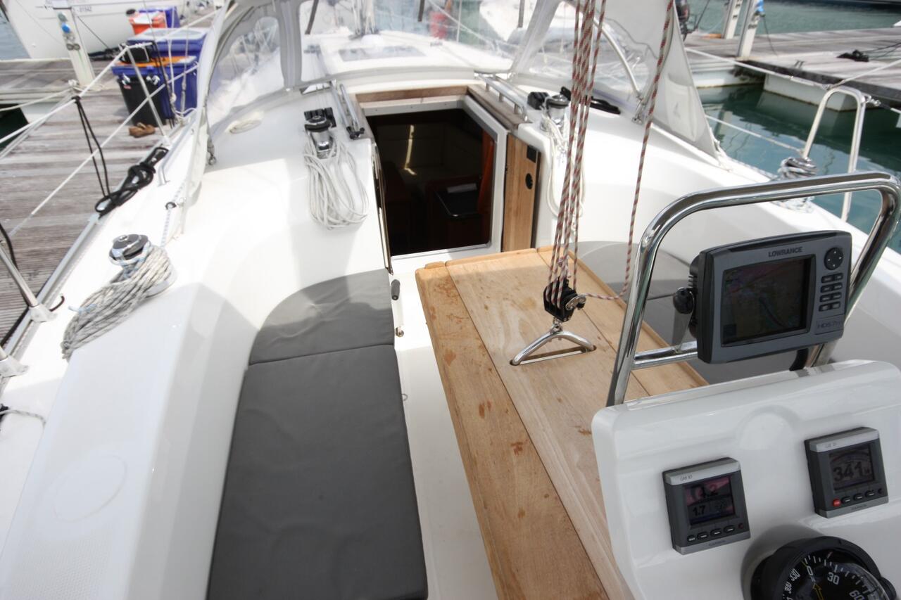 | Outside | Anker mit Kette, Badeleiter, Biminitop, Bootshaken, Cockpitdusche, Cockpitpolster, Cockpittisch, Davits, Deckbürste, elektr. Ankerwinsch, Fender, Festmacherleinen, Kunststoff-Eimer (Pütz), Schnorchelausrüstung, Solaranlage, Winschen |