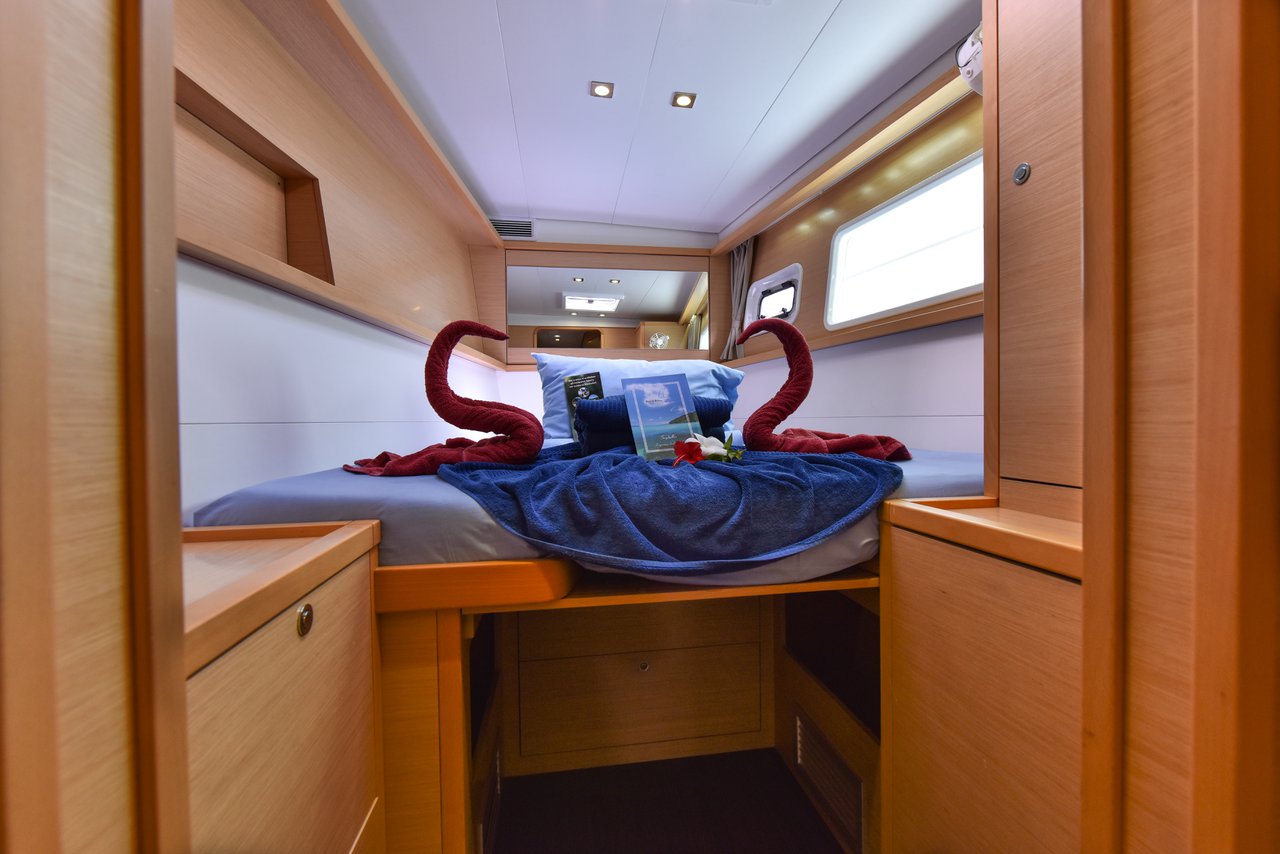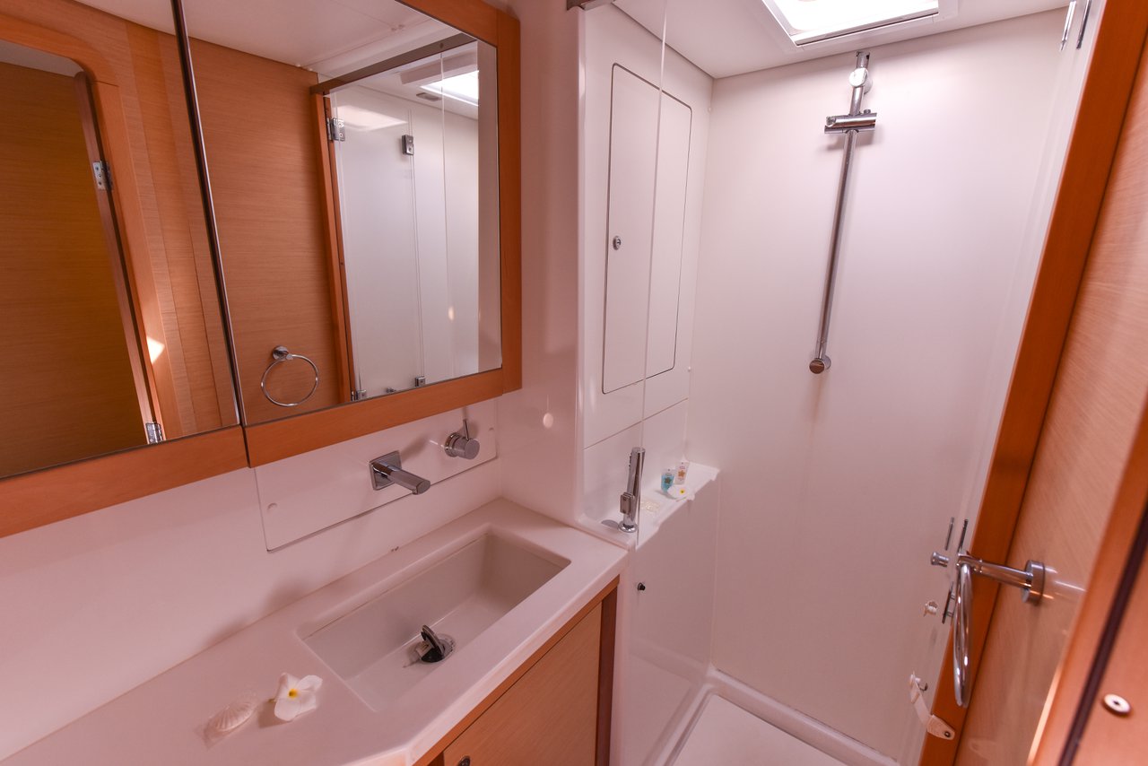 | Inside | Eiswürfelmaschine, Frischwasserpumpe, Gefrierschrank, Generator, Inverter 12V/220V, Klimaanlage (ohne Landstrombedarf), Kühlschrank, Ladegerät, Lautsprecher im Salon, Mikrowelle, Pantryausstattung, Radio mit CD/MP3/USB, Satelliten-Telefon, TV, USB Steckdose, Ventilatoren in Kabinen, Watermaker, WC (elektr.) |