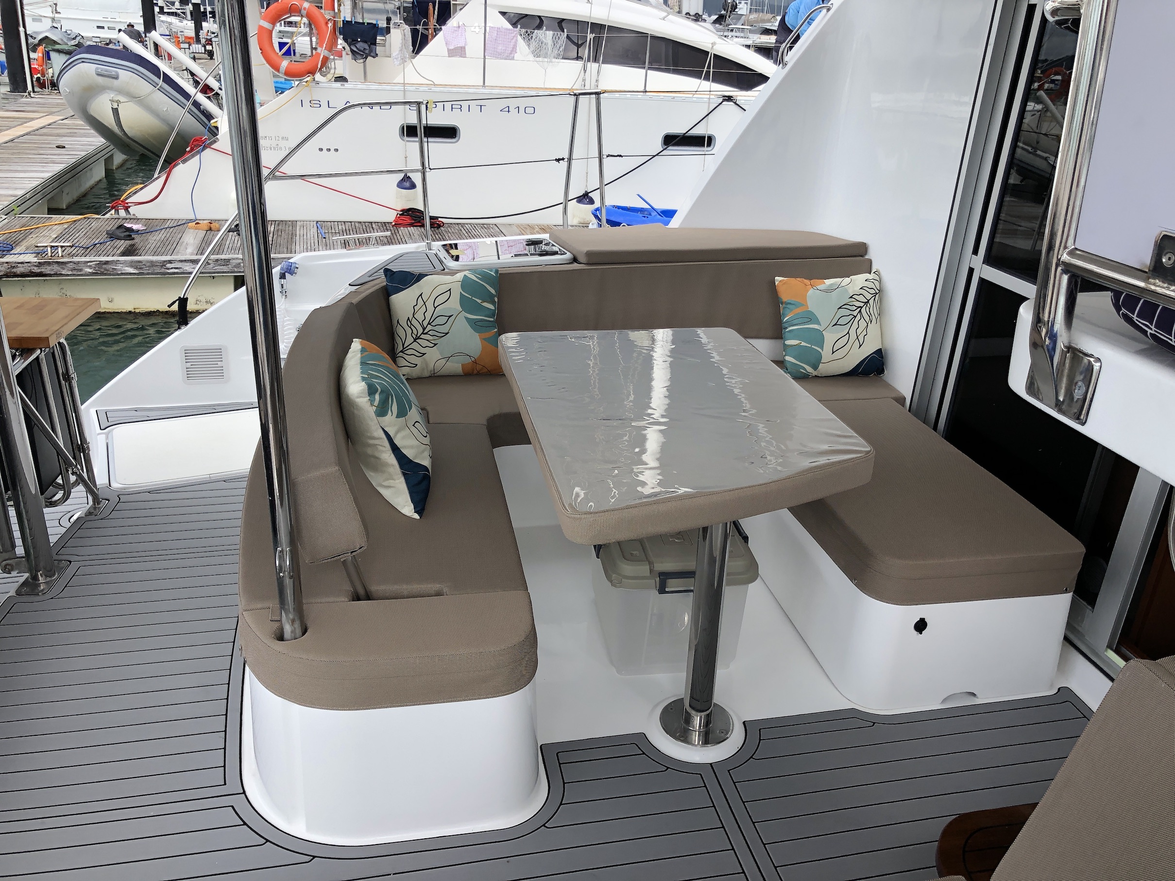| Outside | Anker mit Kette, Biminitop, Cockpitdusche, Cockpitlautsprecher, Cockpitpolster, Cockpittisch, Davits, elektr. Ankerwinsch, Grill, Hardtop, Schnorchelausrüstung, Solaranlage |
