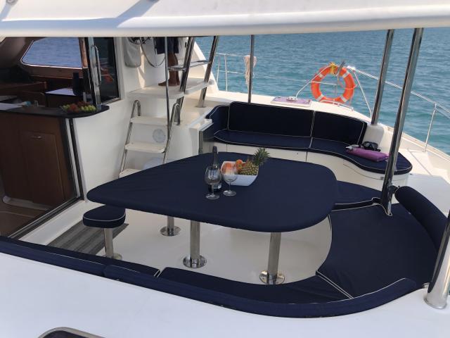 | Outside | Biminitop, Cockpitdusche, Davits, elektr. Ankerwinsch, Grill, Schnorchelausrüstung, Solaranlage |