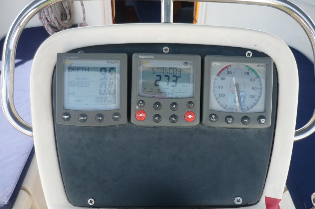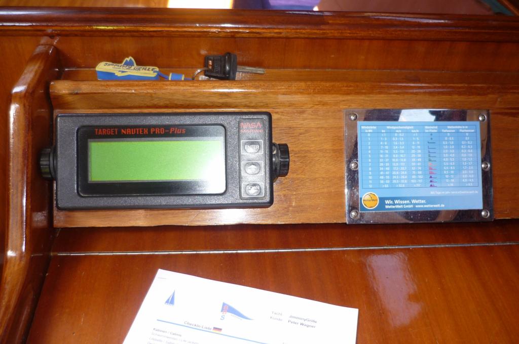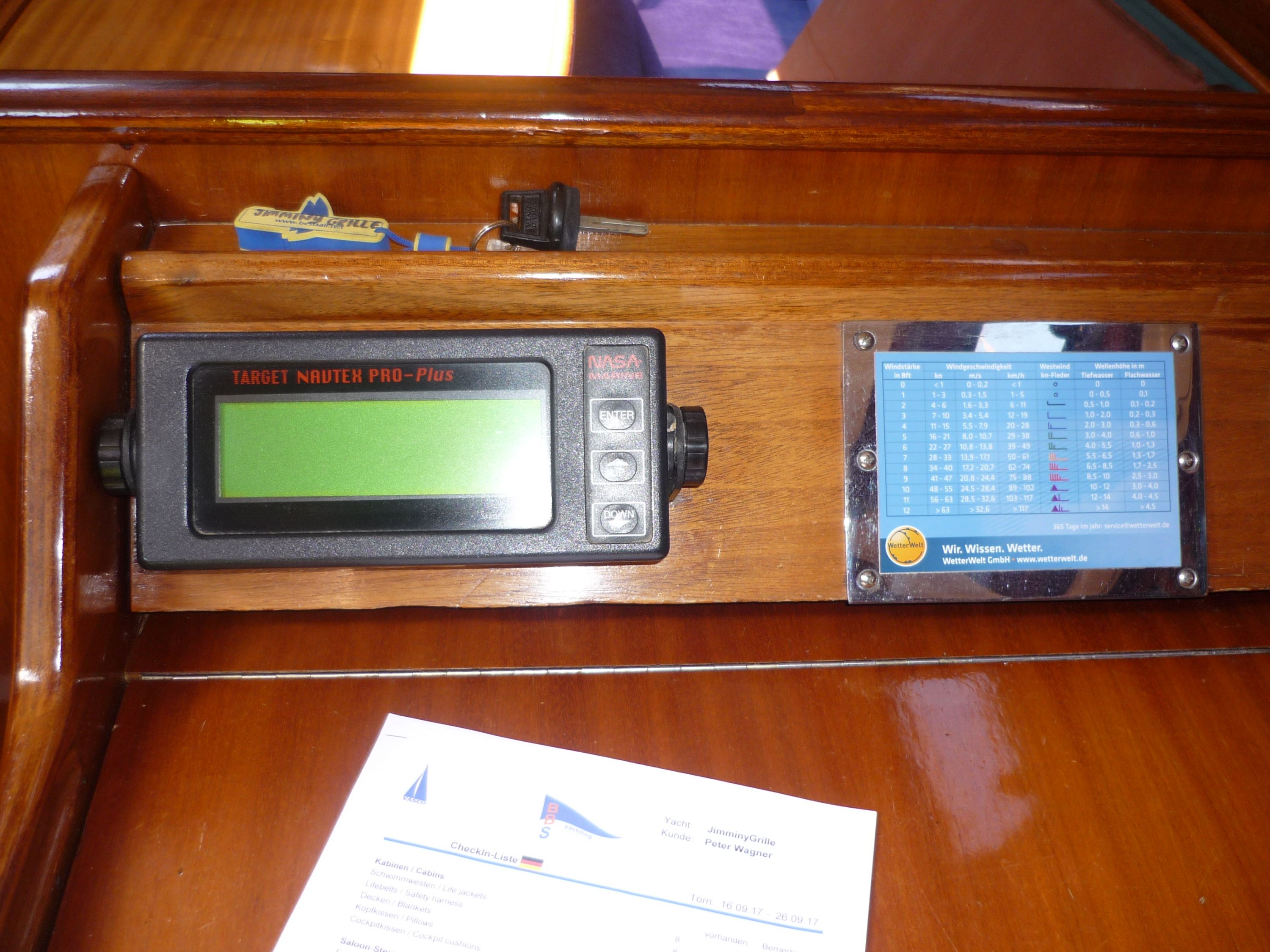 | Navigation | Barometer, Echolot, GPS mit Kartenplotter im Salon, Kompass, Seekarten, Sumlog, Windmesser |