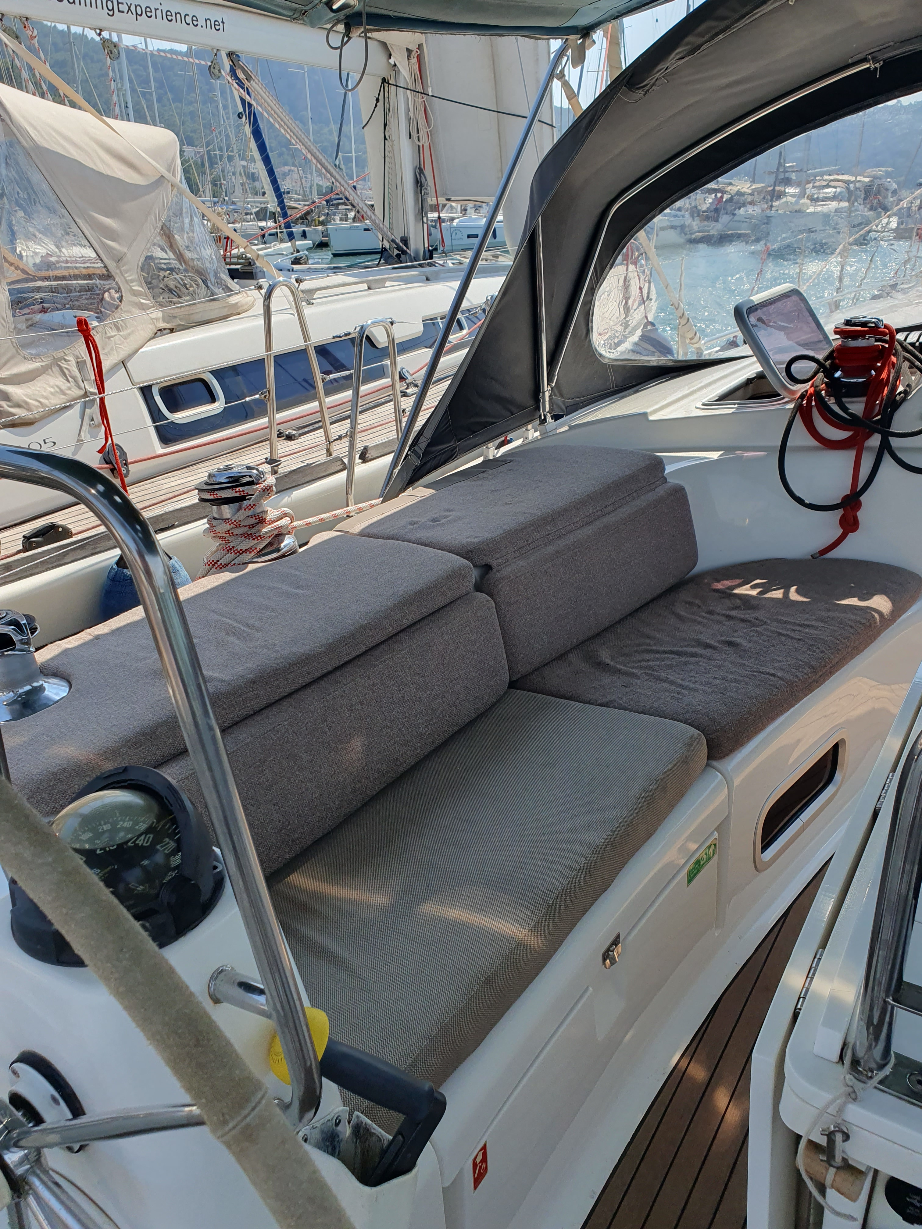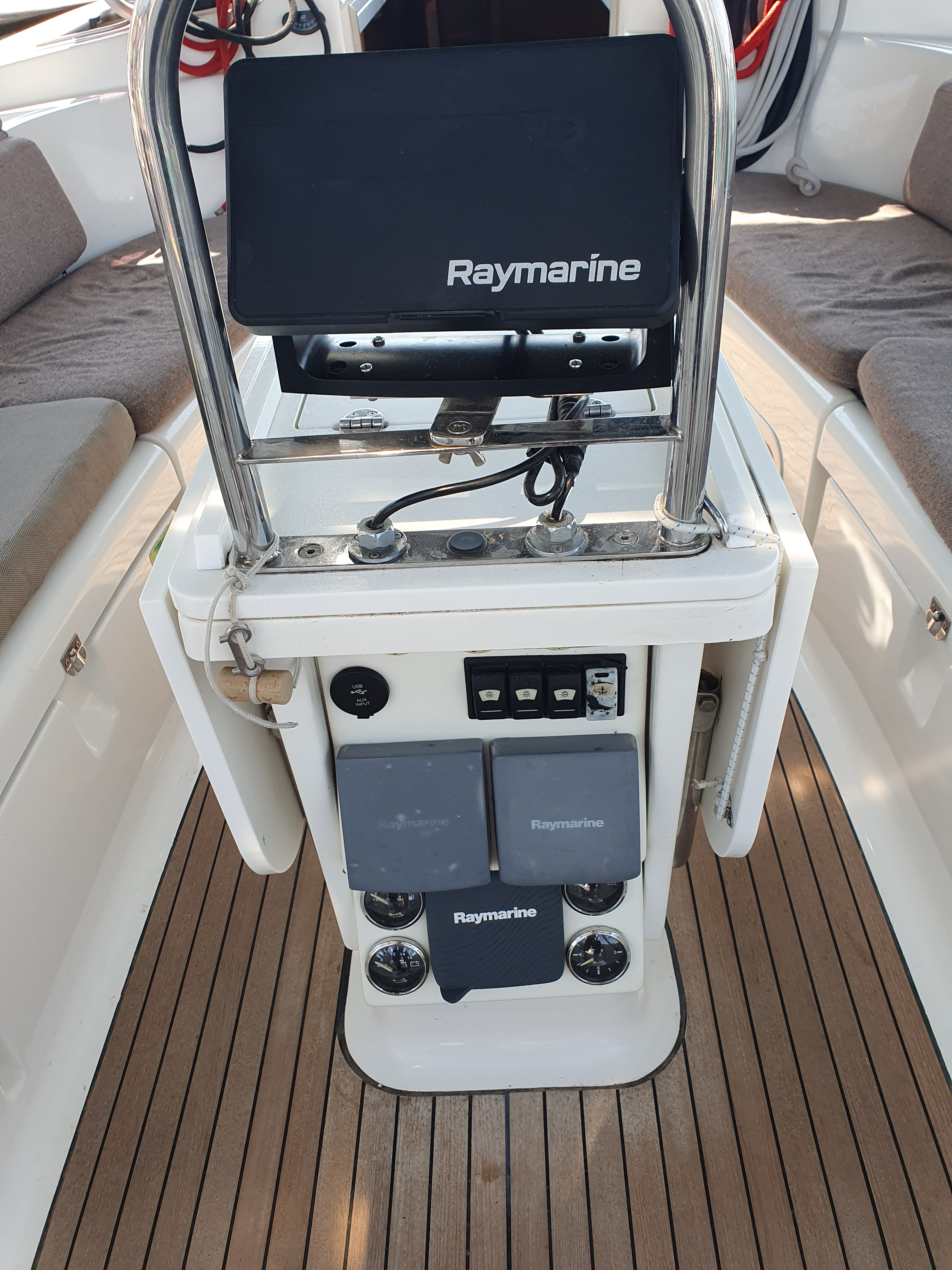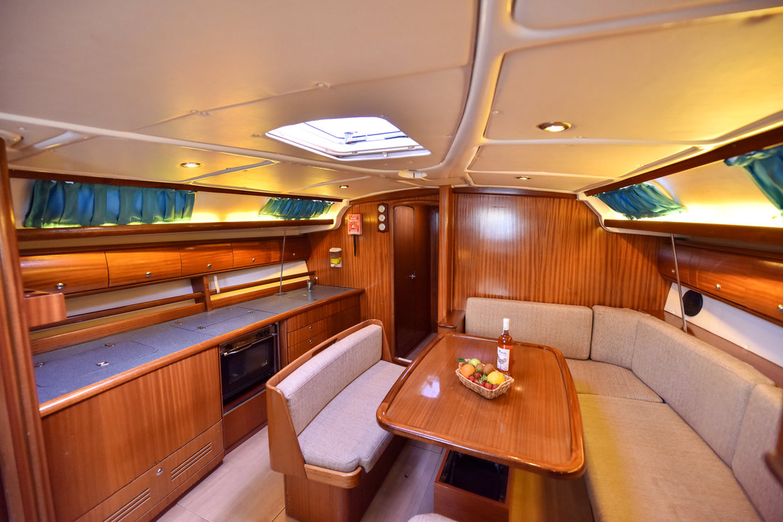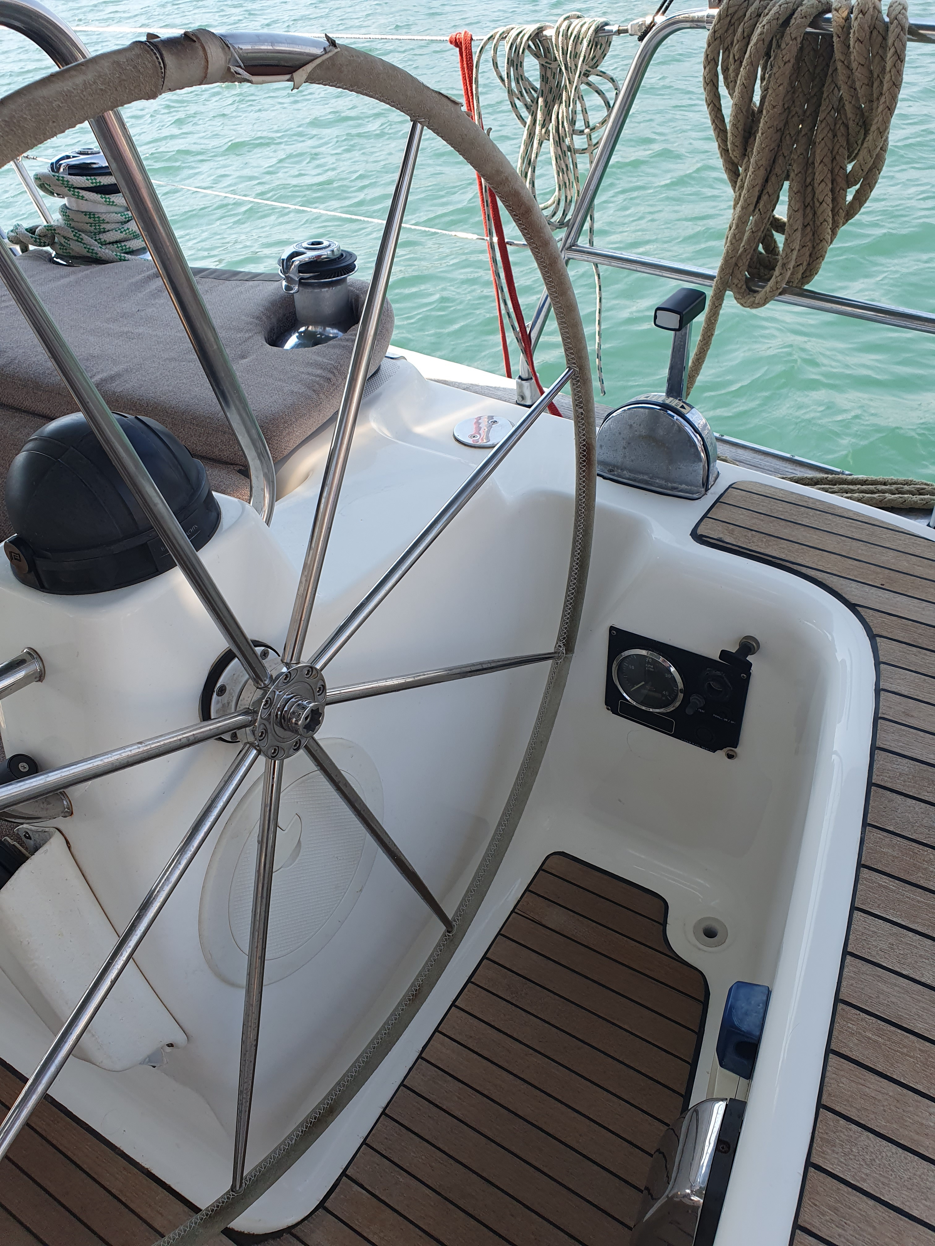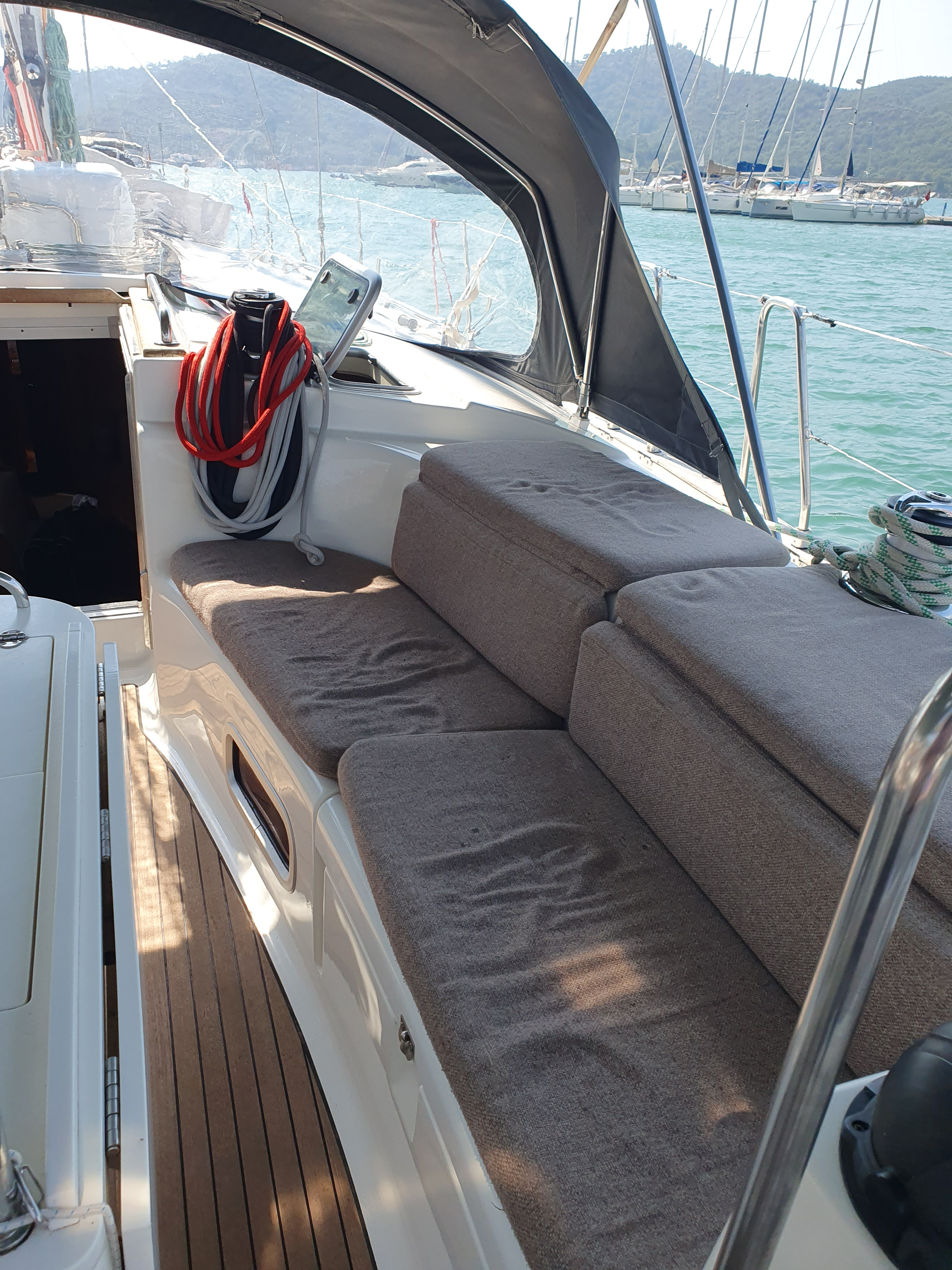 | Outside | Anker mit Kette, Ankerwinsch, Biminitop, Bootshaken, Cockpitlautsprecher, Cockpitleuchte, Cockpitpolster, elektr. Ankerwinsch, Fender, Festmacherleinen, Gangway, Kugelfender, Solaranlage, Sprayhood, Teak im Cockpit, Winschen |
