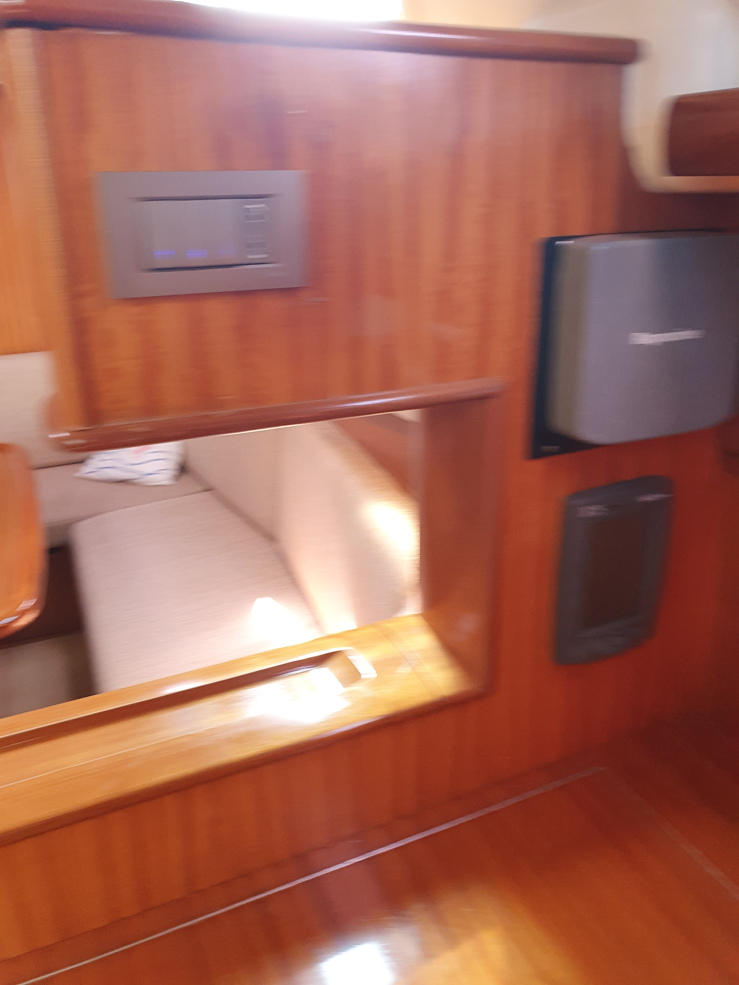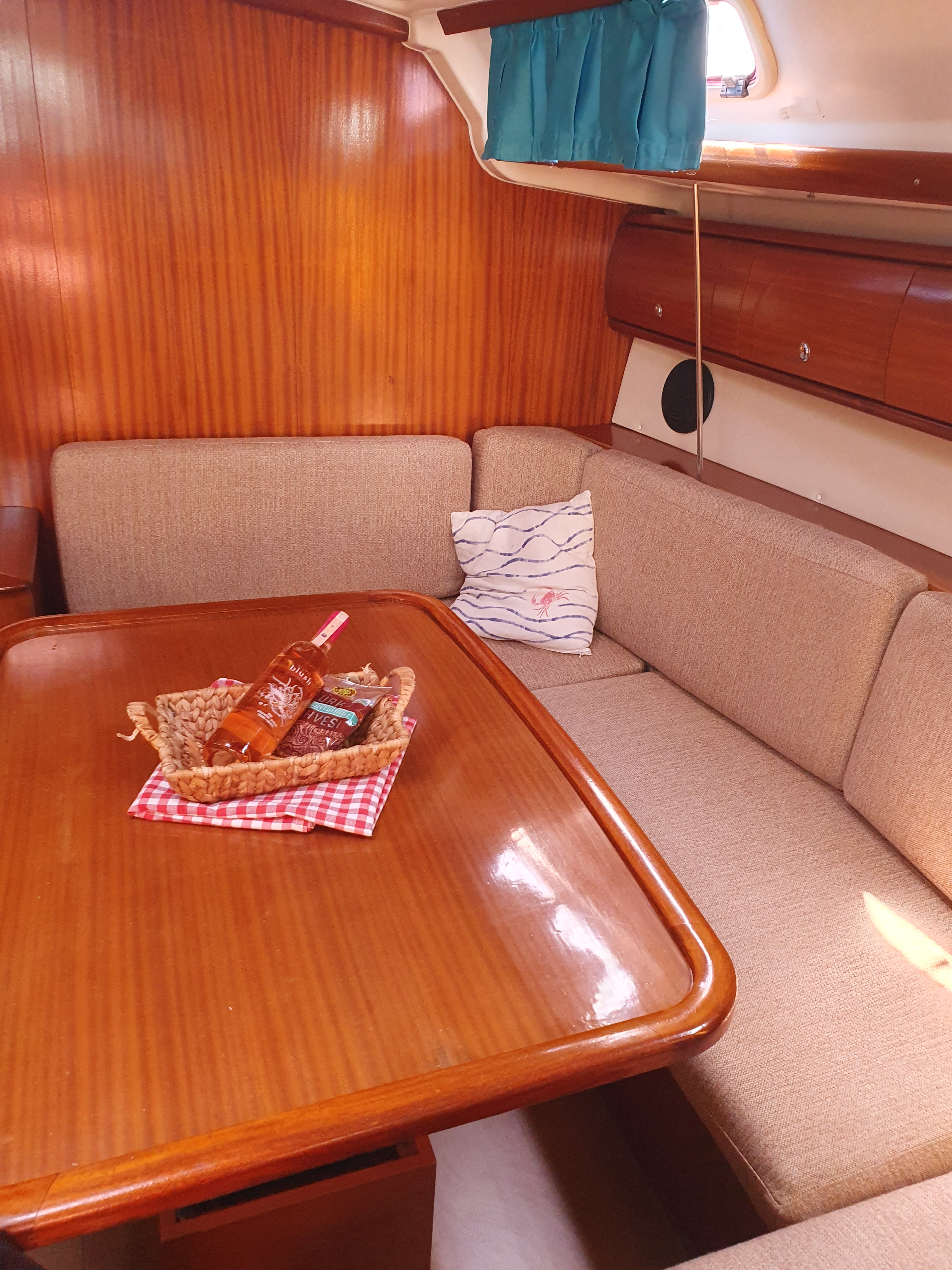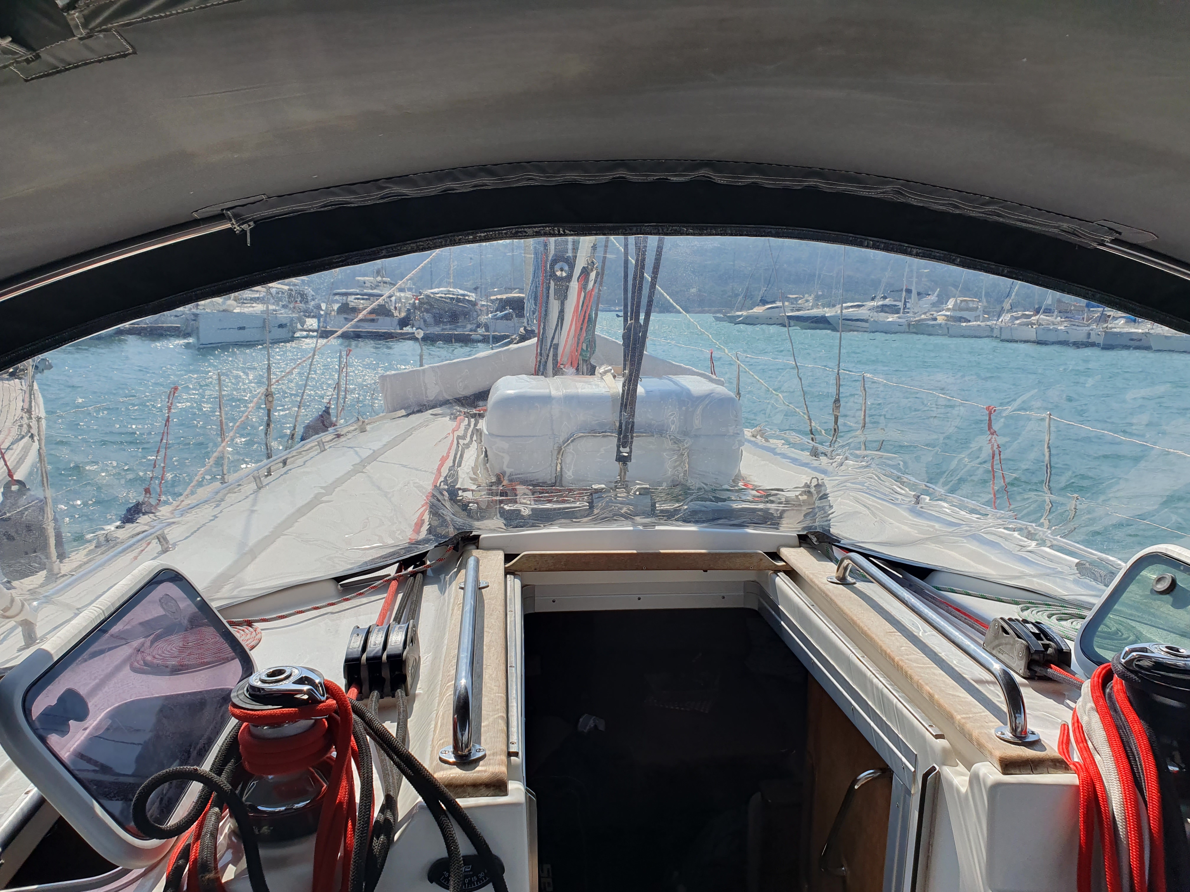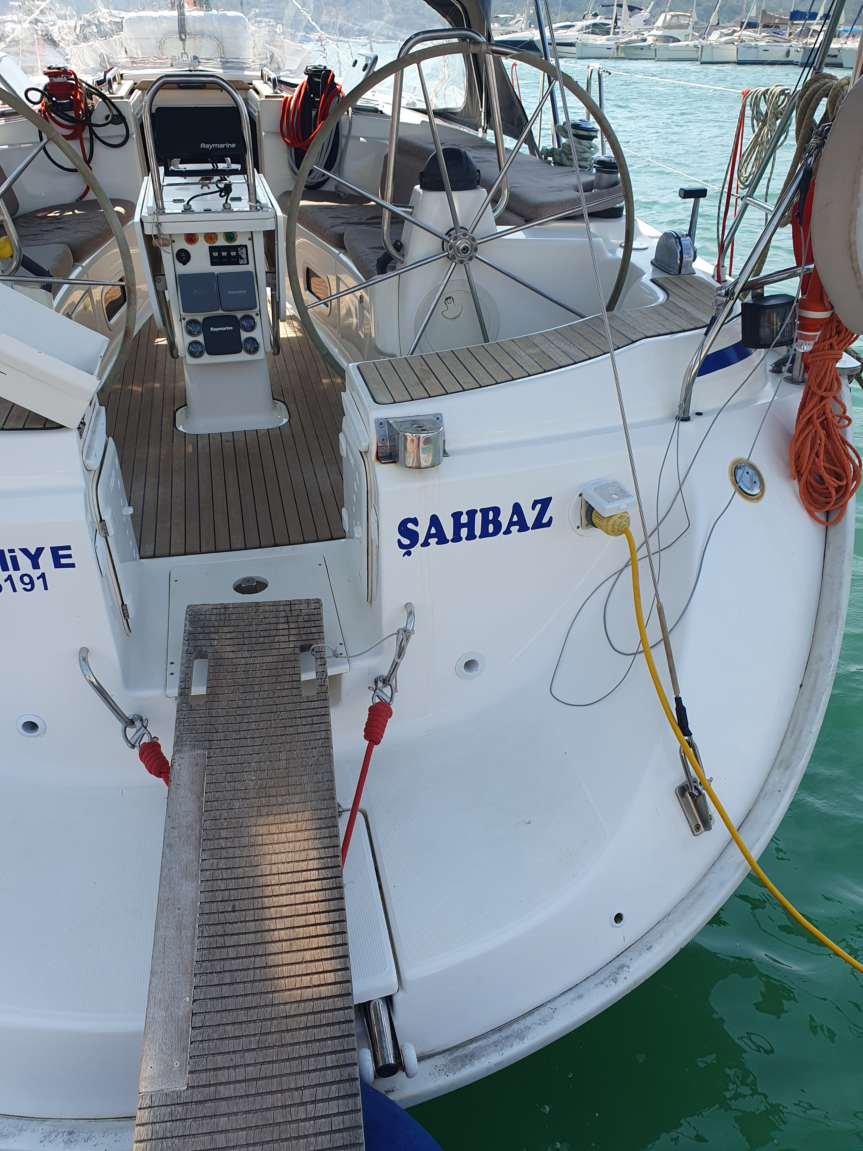 | Outside | Anker mit Kette, Ankerwinsch, Biminitop, Bootshaken, Cockpitlautsprecher, Cockpitleuchte, Cockpitpolster, elektr. Ankerwinsch, Fender, Festmacherleinen, Gangway, Kugelfender, Solaranlage, Sprayhood, Teak im Cockpit, Winschen |
