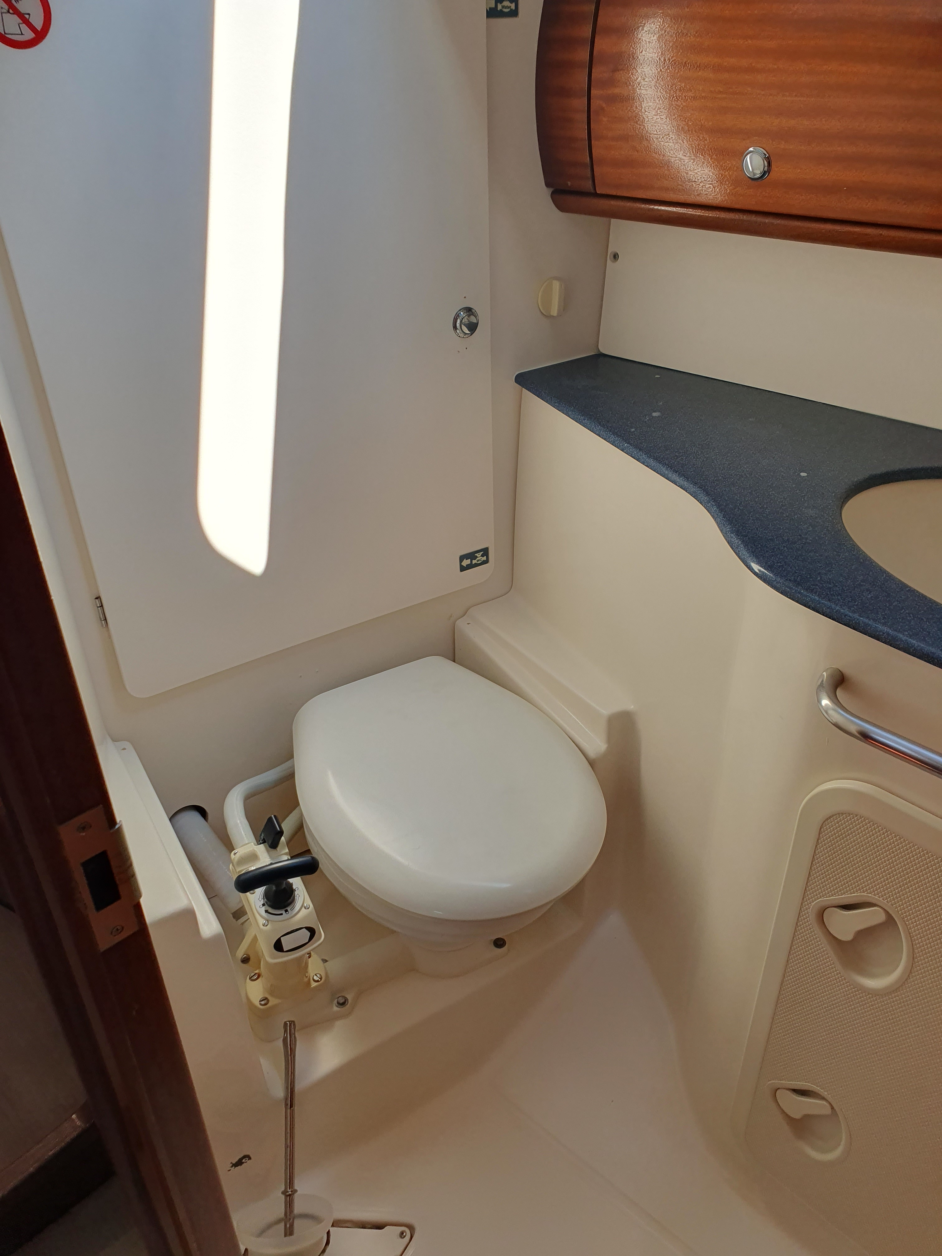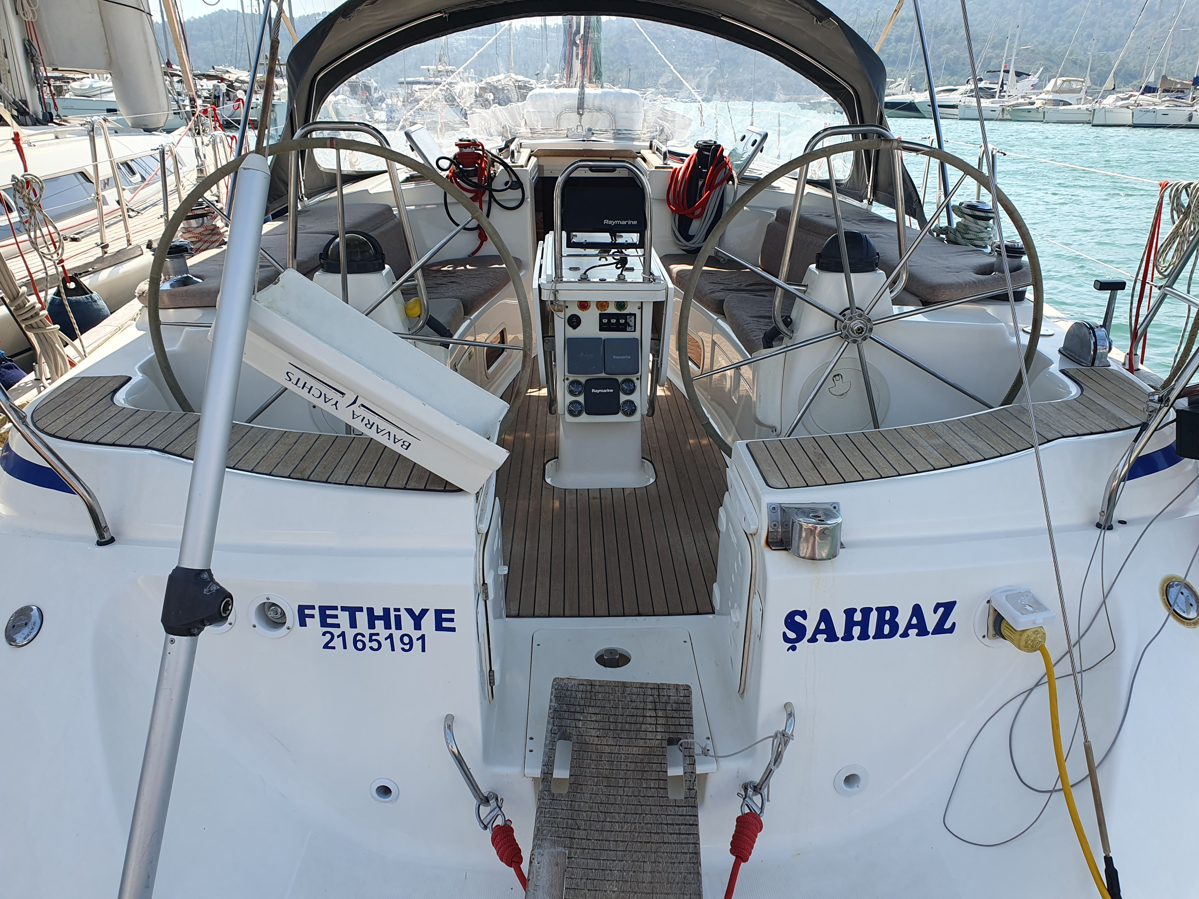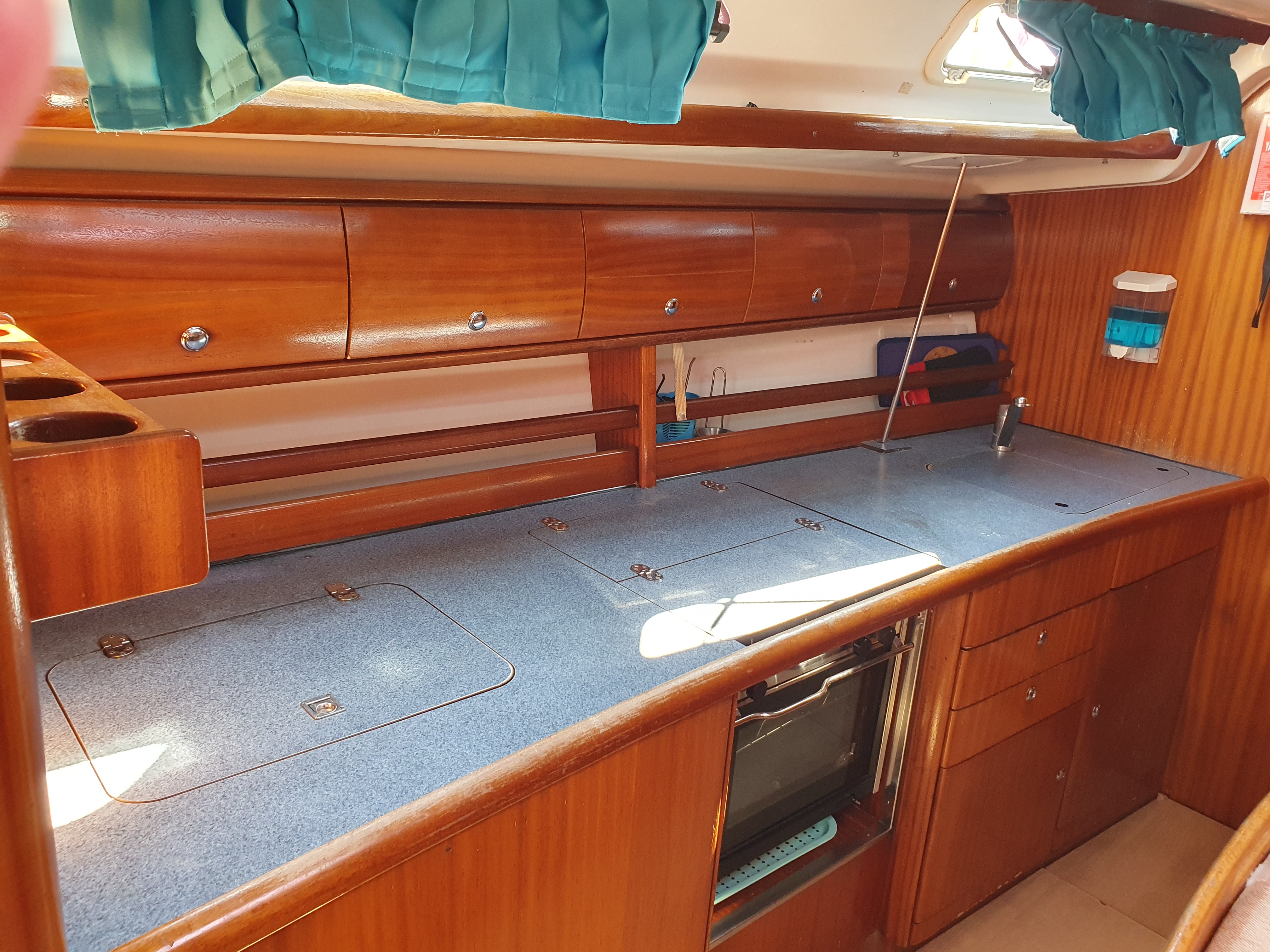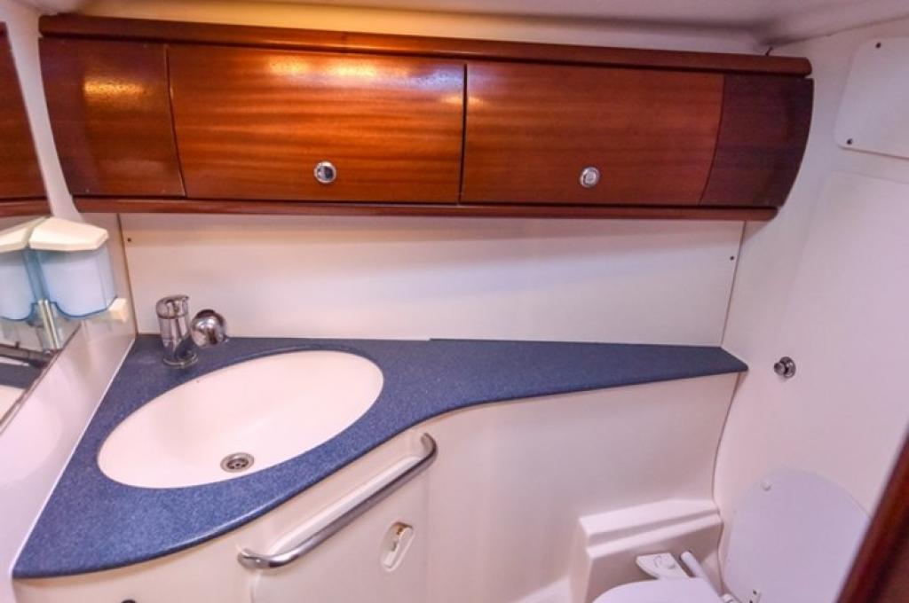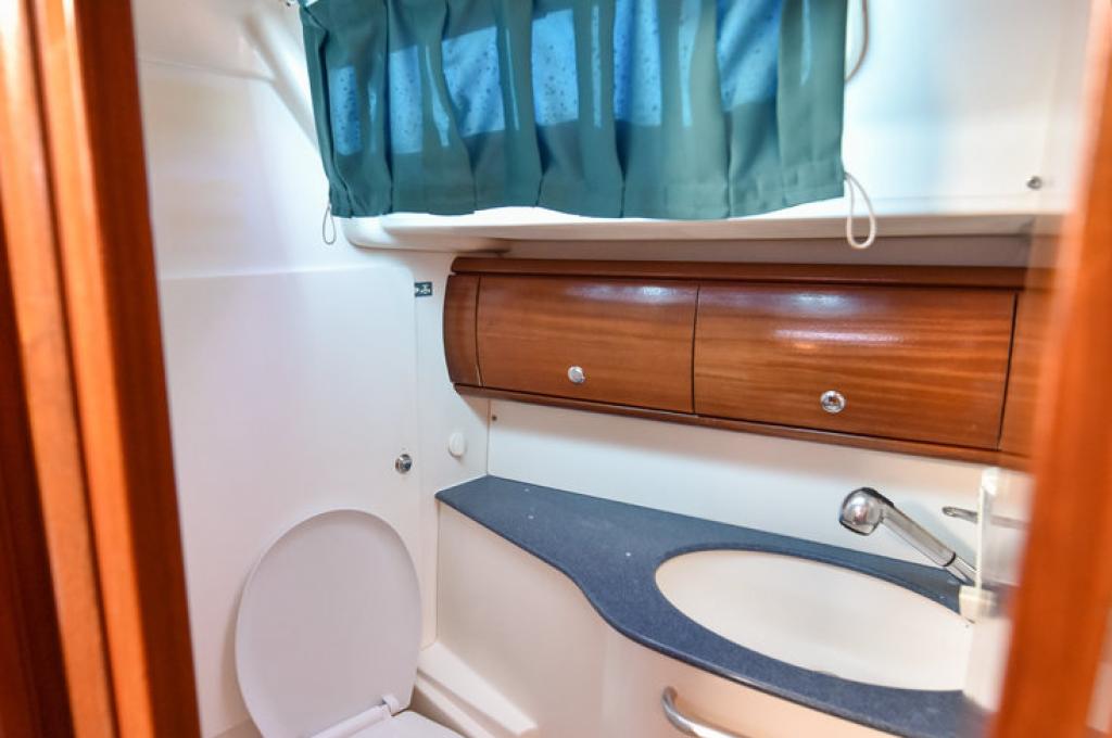 | Outside | Anker mit Kette, Ankerwinsch, Biminitop, Bootshaken, Cockpitlautsprecher, Cockpitleuchte, Cockpitpolster, elektr. Ankerwinsch, Fender, Festmacherleinen, Gangway, Kugelfender, Solaranlage, Sprayhood, Teak im Cockpit, Winschen |