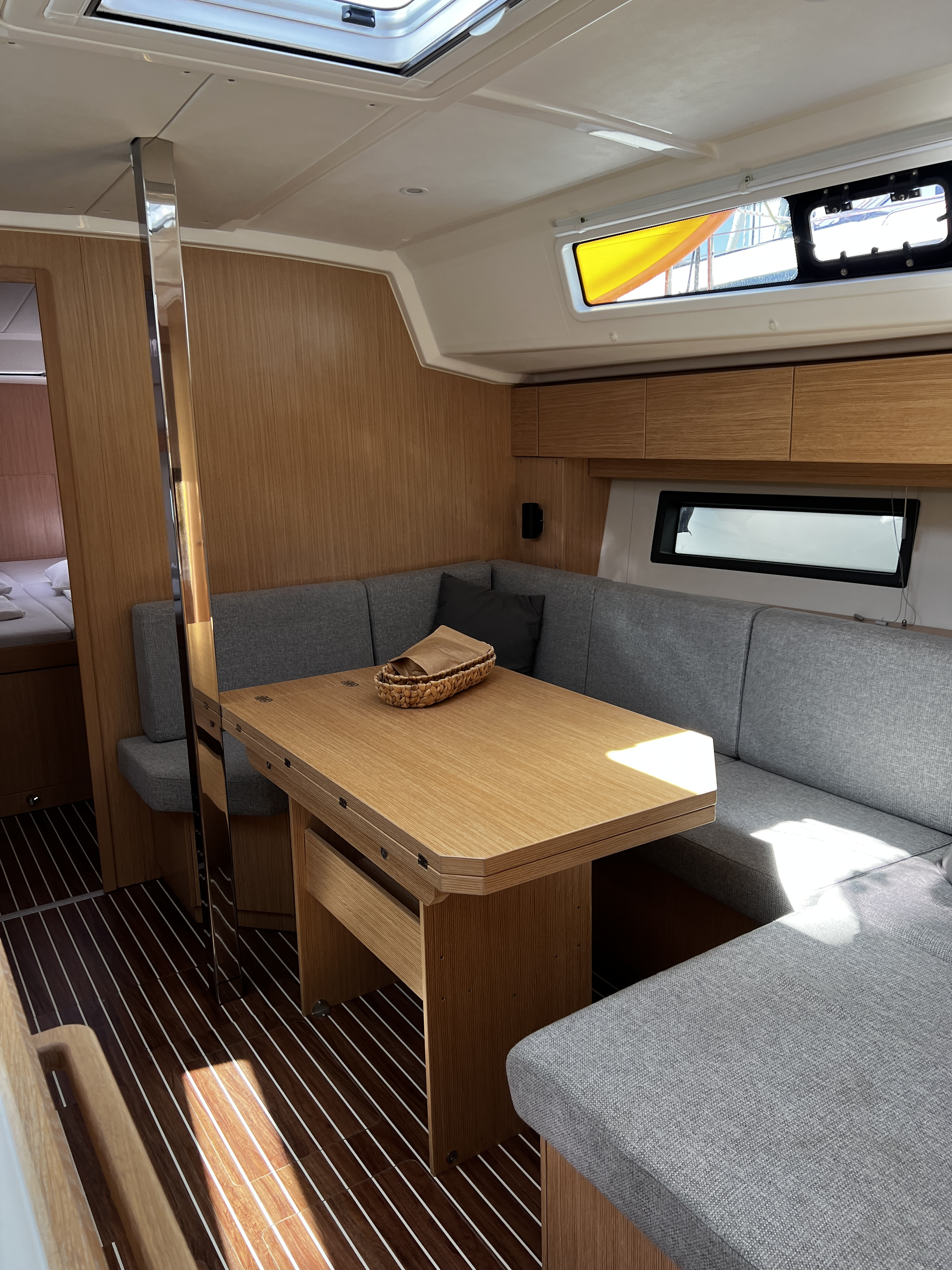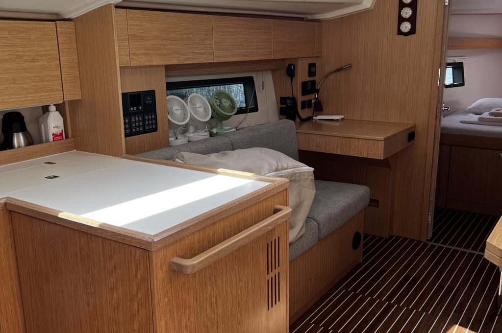 | Outside | 220 V-Landanschluss, Anker mit Kette, Badeleiter, Badeplattform, Biminitop, Cockpitdusche, Cockpitpolster, Cockpittisch, Delta-Anker, elektr. Ankerwinsch, Fender, Festmacherleinen, Gangway, Kunststoff-Eimer (Pütz), Rodkicker, Solaranlage, Sprayhood, Teak im Cockpit, Wantenschneider, Winschen |
