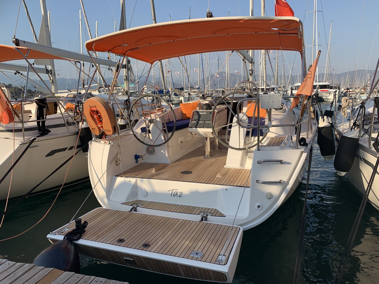 | Outside | Anker mit Kette, Badeleiter, Badeplattform, Biminitop, Bootshaken, Cockpitdusche, Cockpitleuchte, Cockpitpolster, Cockpittisch, Deckbürste, elektr. Ankerwinsch, Fender, Festmacherleinen, Gangway, Kunststoff-Eimer (Pütz), Sonnendeck, Teak im Cockpit, Wasserkanister , Wasserschlauch, Windex, Winschen |