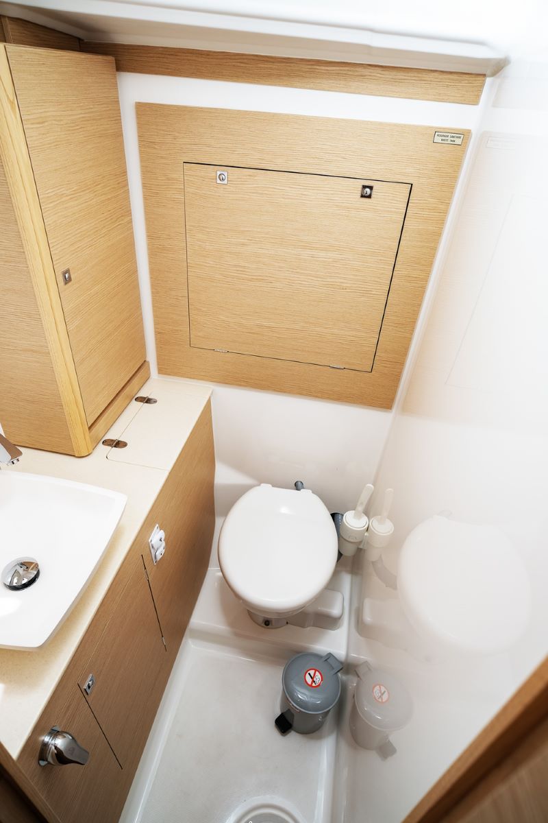 | Outside | 220 V-Landanschluss, Anker mit Kette, Badeleiter, Badeplattform, Biminitop, Cockpitdusche, Cockpitpolster, Cockpittisch (klappbar), Delta-Anker, Fender, Fernsteuerung für elektr. Ankerwinsch, Festmacherleinen, Gangway, Kunststoff-Eimer (Pütz), Lifeline System, Rodkicker, Solaranlage, Sprayhood, Teak im Cockpit, Wantenschneider, Wasserschlauch, Winschen |