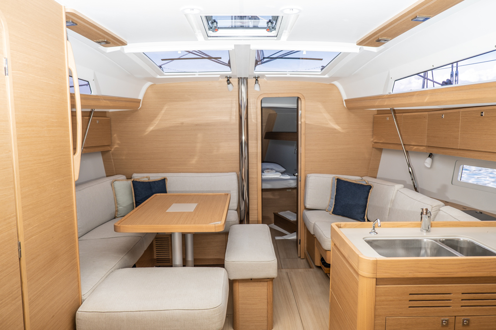 | Outside | 220 V-Landanschluss, Anker mit Kette, Badeleiter, Badeplattform, Biminitop, Cockpitdusche, Cockpitpolster, Cockpittisch, Cockpittisch (klappbar), elektr. Ankerwinsch, Fender, Fernsteuerung für elektr. Ankerwinsch, Festmacherleinen, Gangway, Kunststoff-Eimer (Pütz), Lifeline System, Rodkicker, Solaranlage, Sprayhood, Teak im Cockpit, Wantenschneider, Wasserschlauch, Winschen |