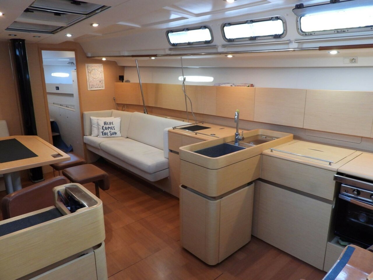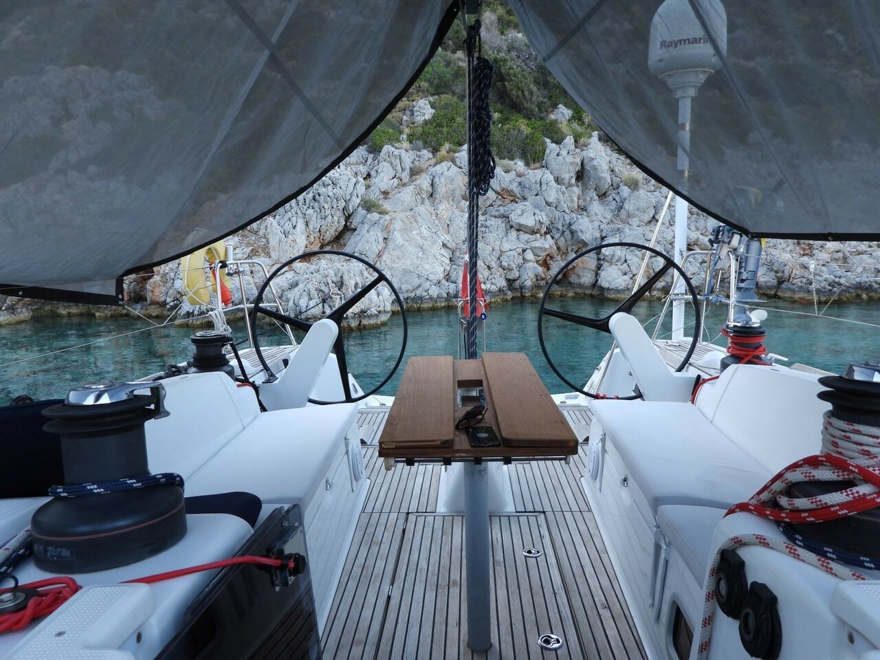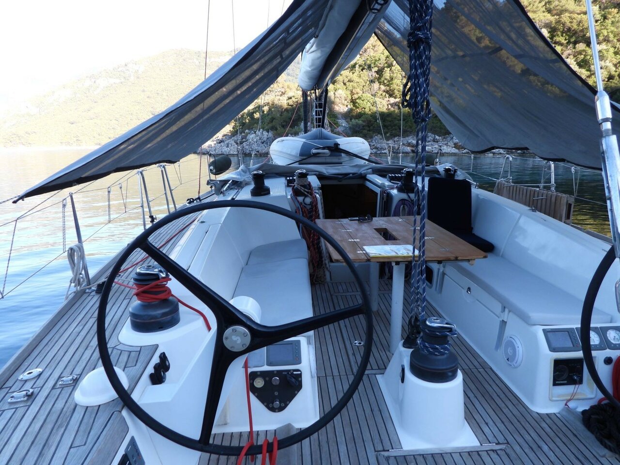 | Outside | Badeleiter, Cockpitdusche, Cockpitlautsprecher, Cockpitpolster, Cockpittisch, elektr. Ankerwinsch, elektr. Winsch, Selbstholende Winschen, Solaranlage, Sprayhood |