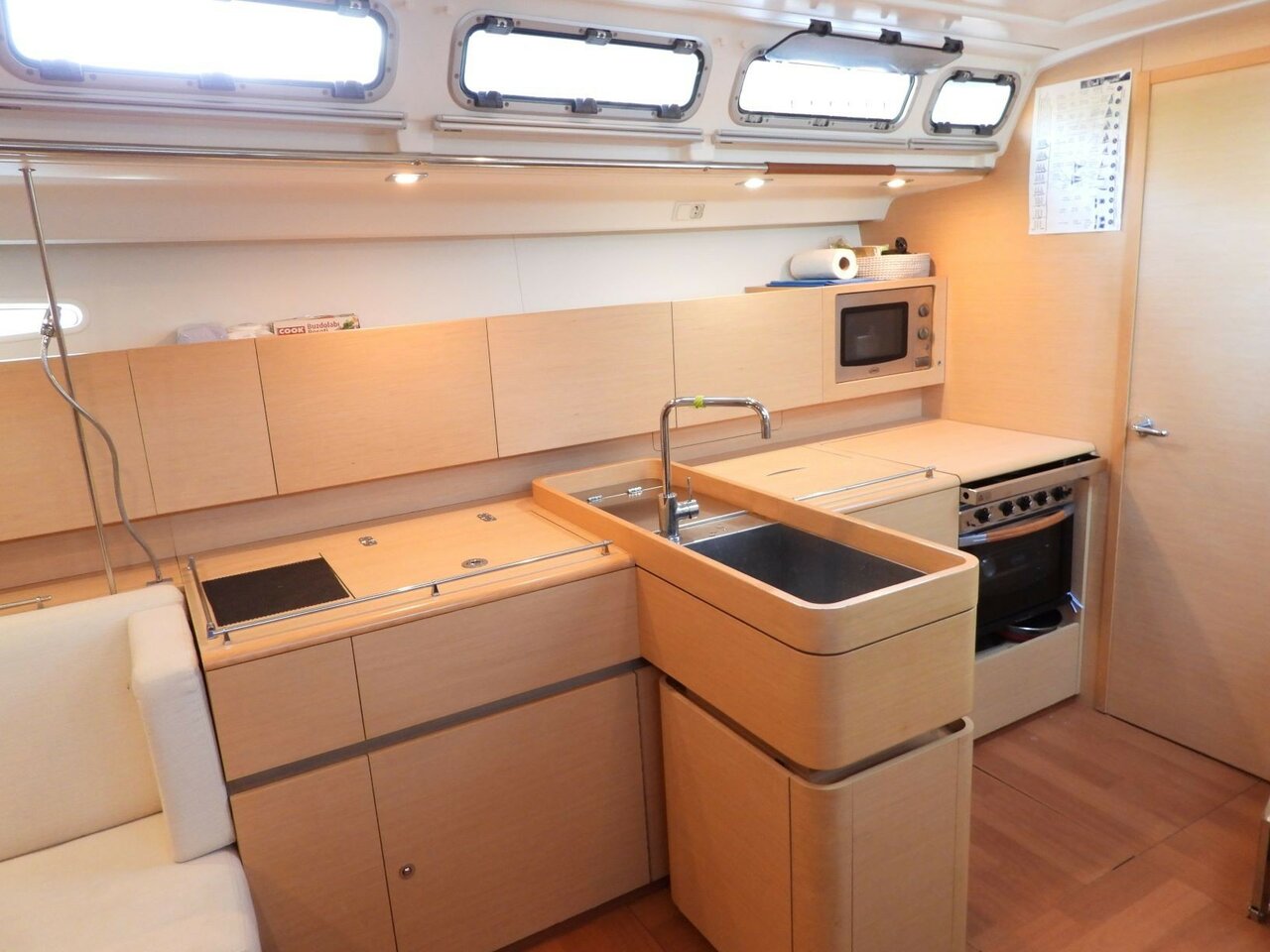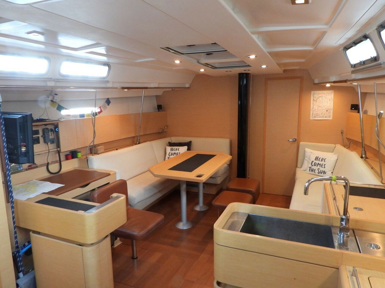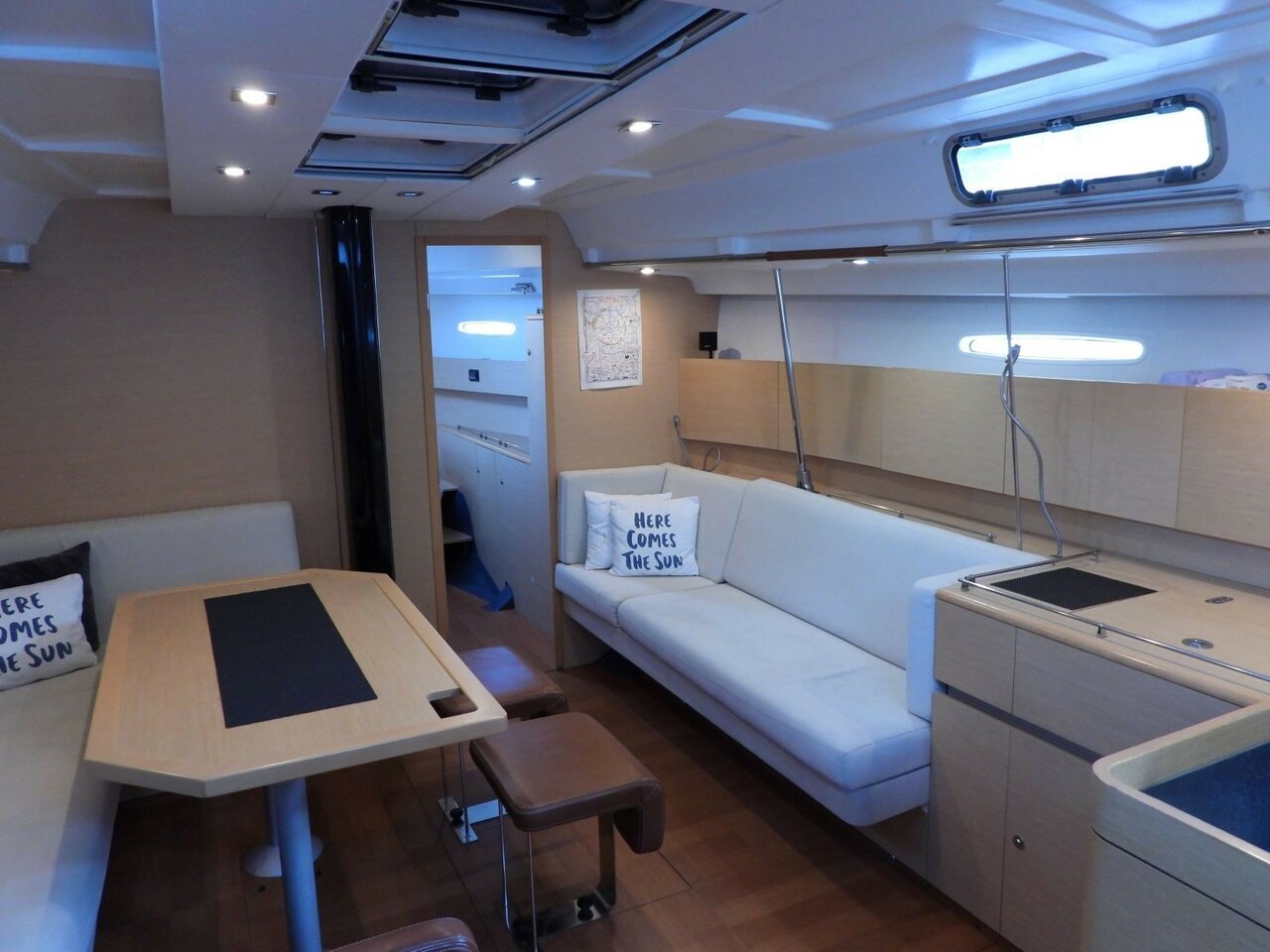 | Outside | Badeleiter, Cockpitdusche, Cockpitlautsprecher, Cockpitpolster, Cockpittisch, elektr. Ankerwinsch, elektr. Winsch, Selbstholende Winschen, Solaranlage, Sprayhood |