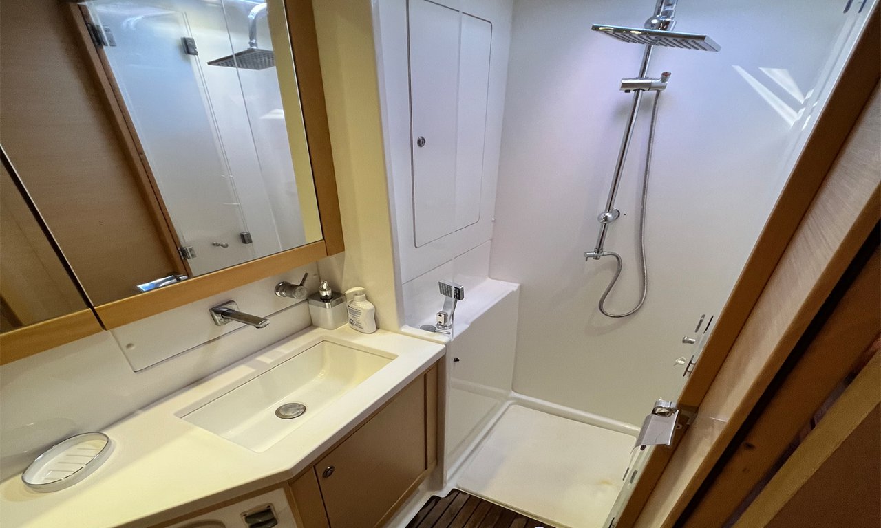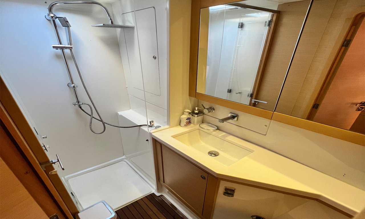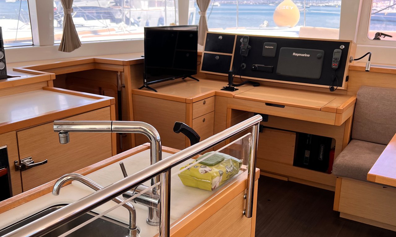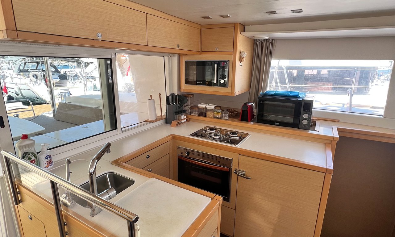 | Inside | Backofen, Gasherd, Gefrierschrank, Generator, Geschirrspüler, Heizung, Inverter 12V/220V, Kaffeemaschine, Klimaanlage (ohne Landstrombedarf), Kühlschrank, Lautsprecher im Salon, Mikrowelle, Pantryausstattung, Radio mit CD, USB Steckdose, Warmwasser, Watermaker, WC (elektr.) |