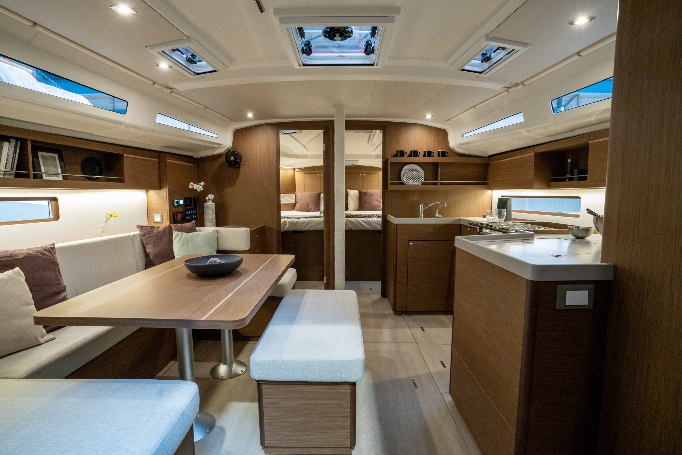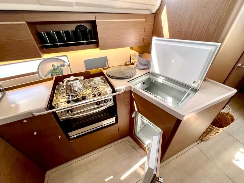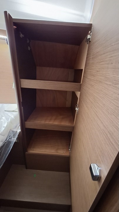 | Inside | Backofen, Borduhr, CD-Player, FUSION Sound System, Gasherd, Gefrierschrank, Geschirr, Heizung, Inverter 12V/220V, Kühlschrank, Lautsprecher im Salon, Pantryausstattung, Radio mit USB, USB Steckdosen in Salon und Kabinen, Ventilatoren in Salon und Kabinen, Warmwasser, WC (elektr.) |