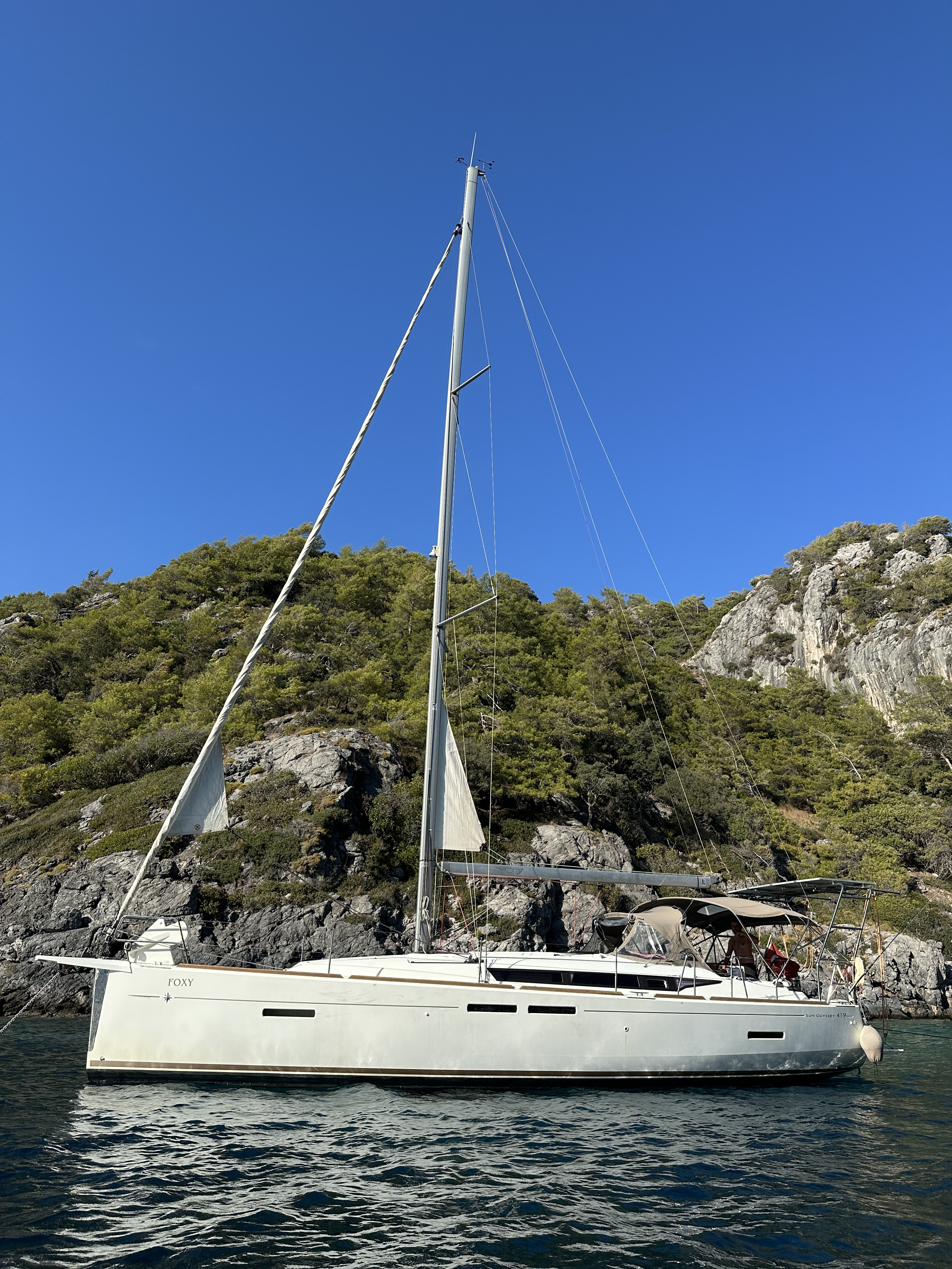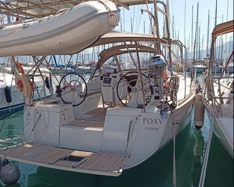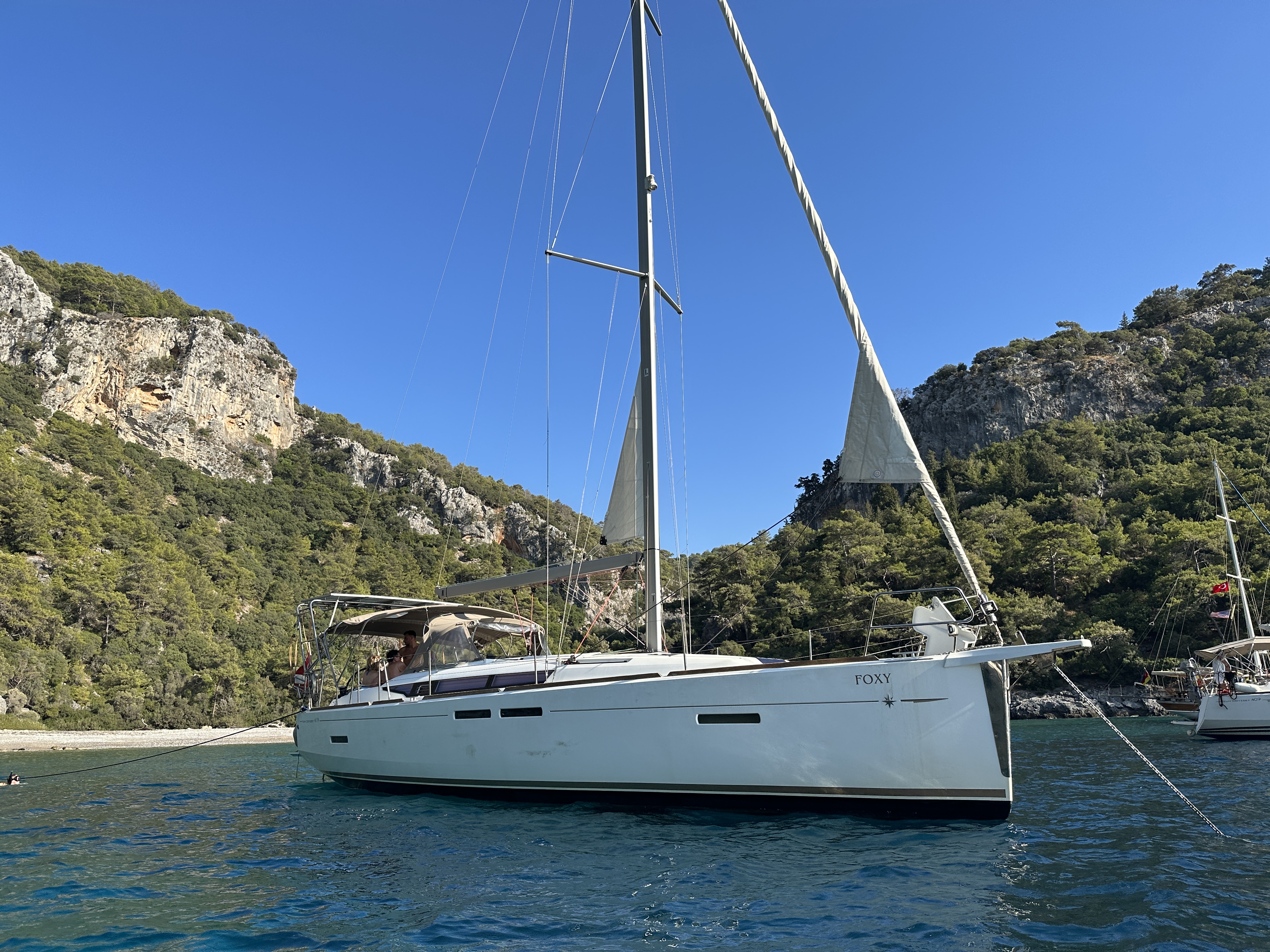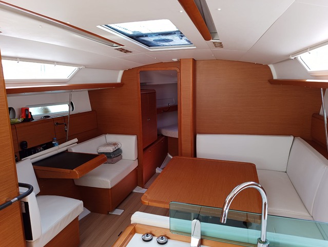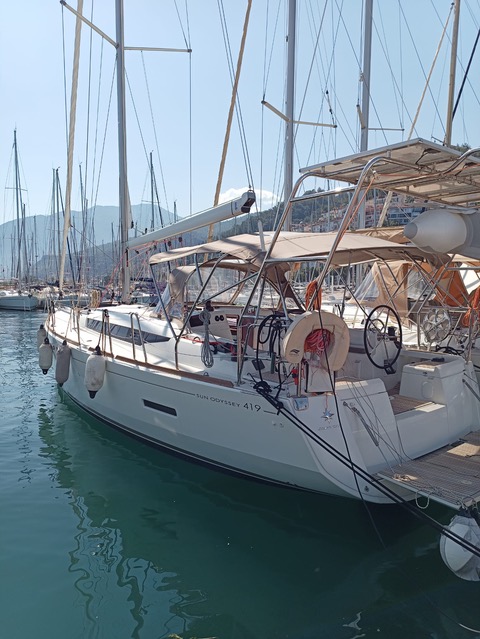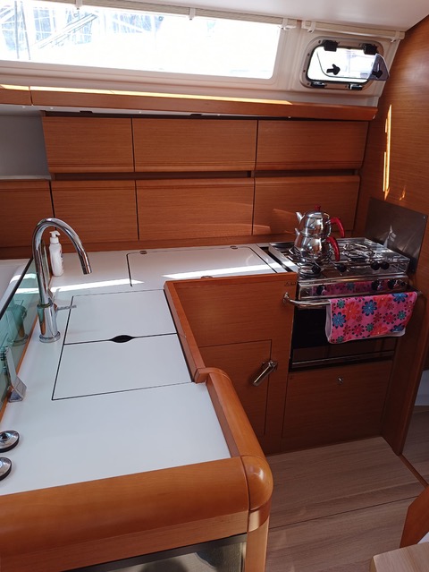| Outside | Anker mit Kette, Badeleiter, Biminitop, Cockpitdusche, Cockpitlautsprecher, Cockpittisch, elektr. Ankerwinsch, Gangway, Solaranlage, Sonnensegel, Sprayhood, Windex |
