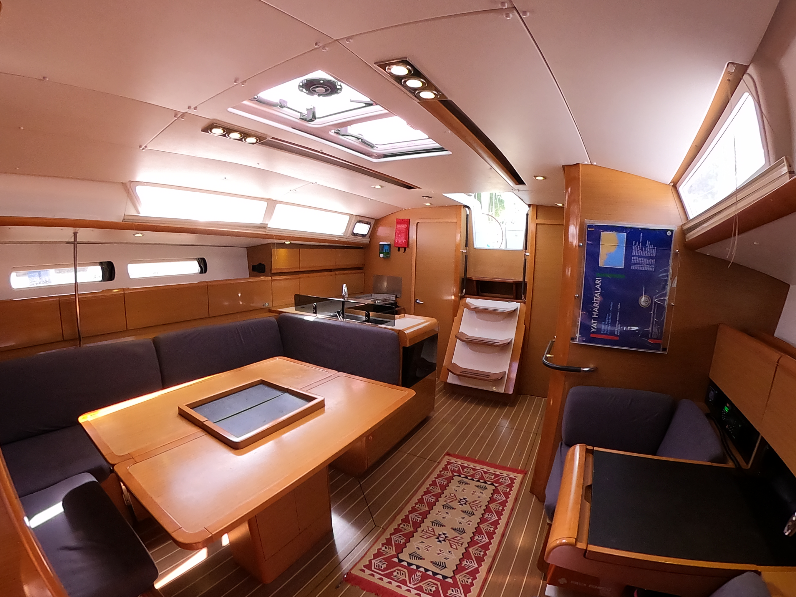 | Outside | Anker mit Kette, Biminitop, Bootshaken, Cockpitleuchte, Cockpitpolster, elektr. Ankerwinsch, Fender, Festmacherleinen, Gangway, Kugelfender, Lifeline System, Solaranlage, Sprayhood, Wantenschneider, Winschen |