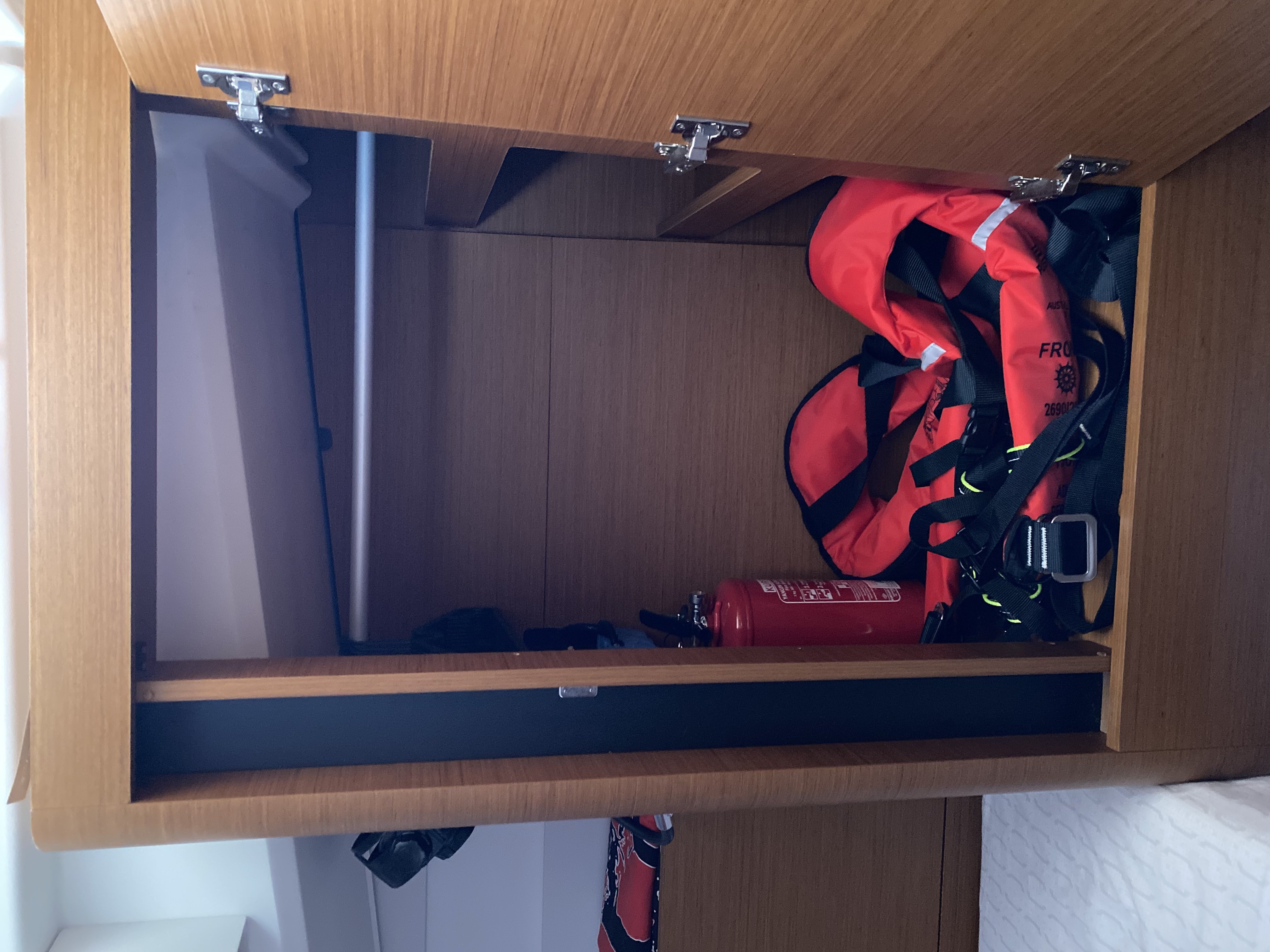 | Safety | Automatikwesten, Autopilot, Bordapotheke, Bugstrahlruder, Feuerlöscher, Flaggen, Leuchtboje, Löschdecke, Nebelhorn, Notsignale, Rettungsinsel, Sicherheitsgurt, Taschenlampe, UKW-Funk, Zweitanker |