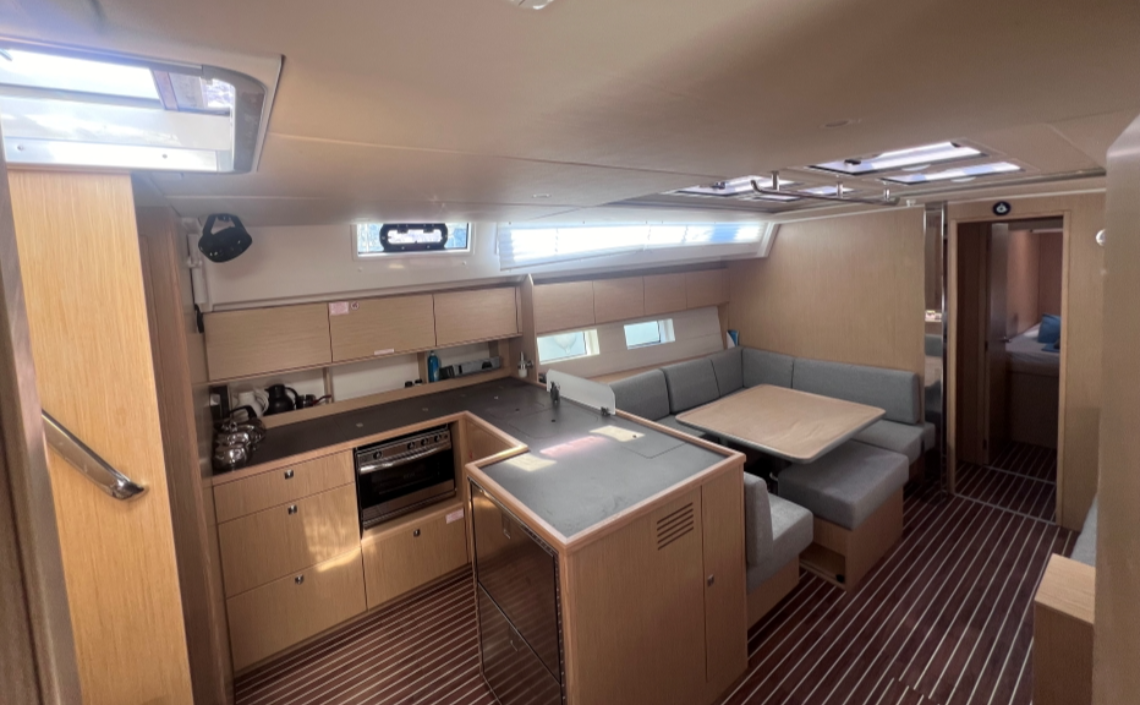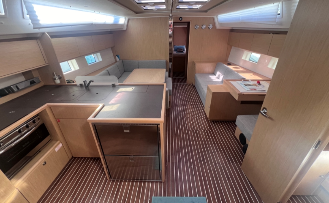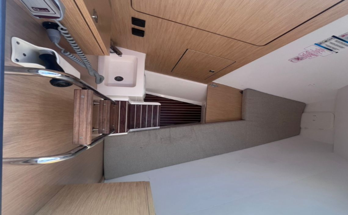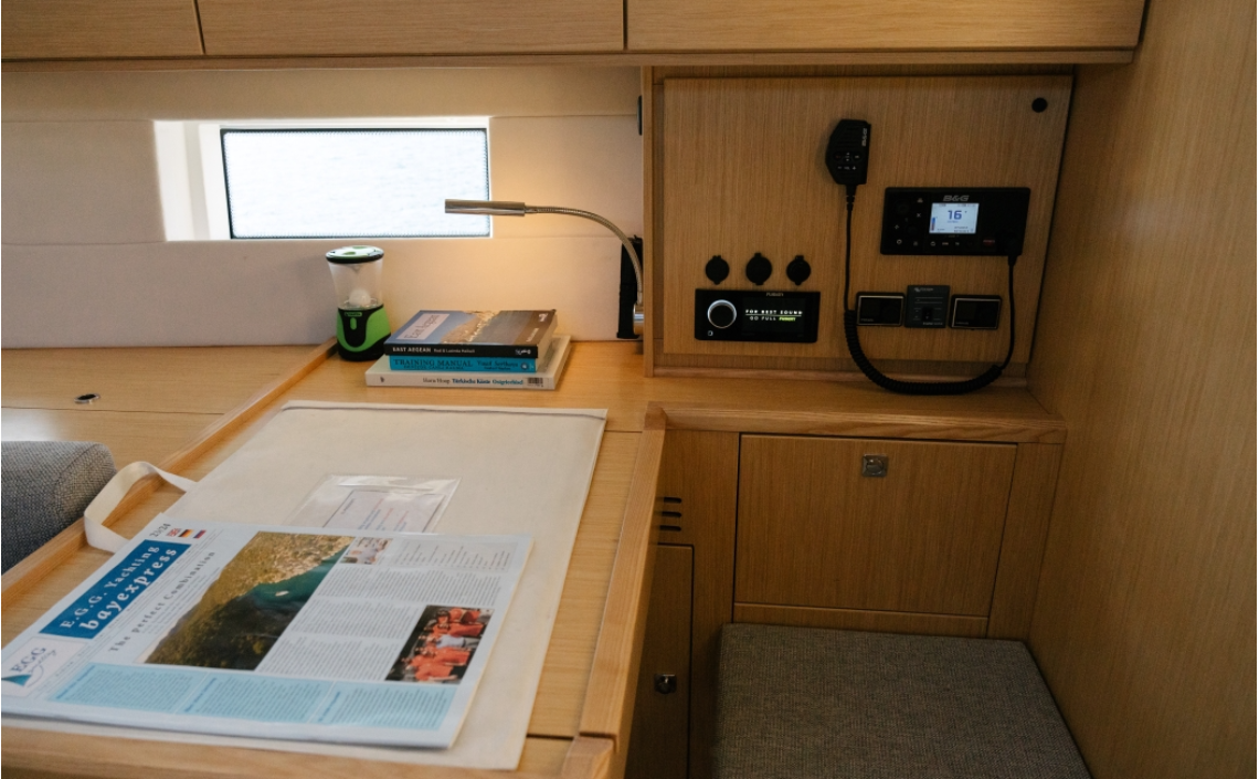 | Inside | 220V Steckdosen, Backofen, Borduhr, Druckwasser, Fäkalientank, Flexschott, Gasherd, Heizung, Inverter 12V/220V, Kaffeemaschine, Kühlschrank, Ladegerät, Landstromkabel, Luftpumpe für Beiboot, Pantryausstattung, Radio mit CD, AUX und USB, Spülbecken, Trichter, Warmwasser |