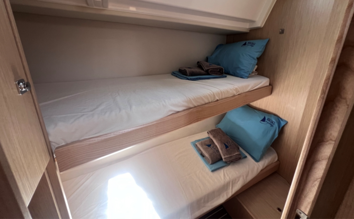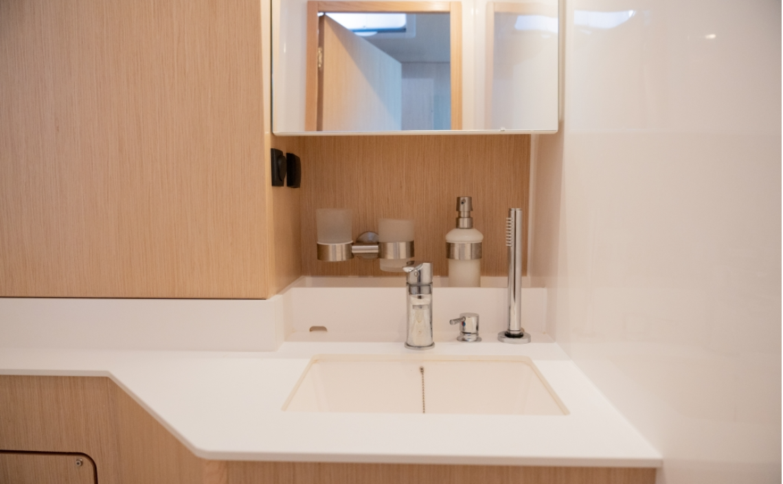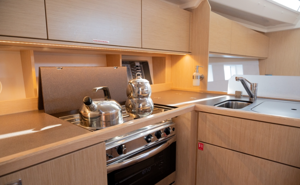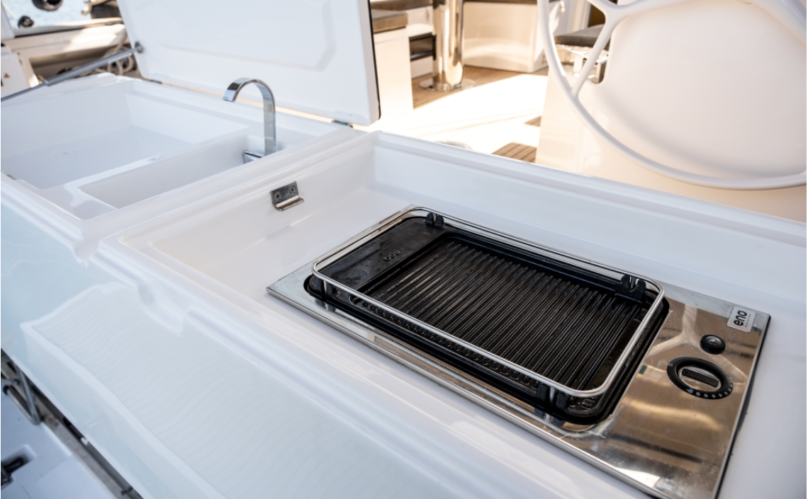| Inside | 220V Steckdosen, Backofen, Borduhr, Druckwasser, Fäkalientank, Flexschott, Gasherd, Heizung, Inverter 12V/220V, Kaffeemaschine, Kühlschrank, Ladegerät, Landstromkabel, Luftpumpe für Beiboot, Pantryausstattung, Radio mit CD, AUX und USB, Spülbecken, Trichter, Warmwasser |