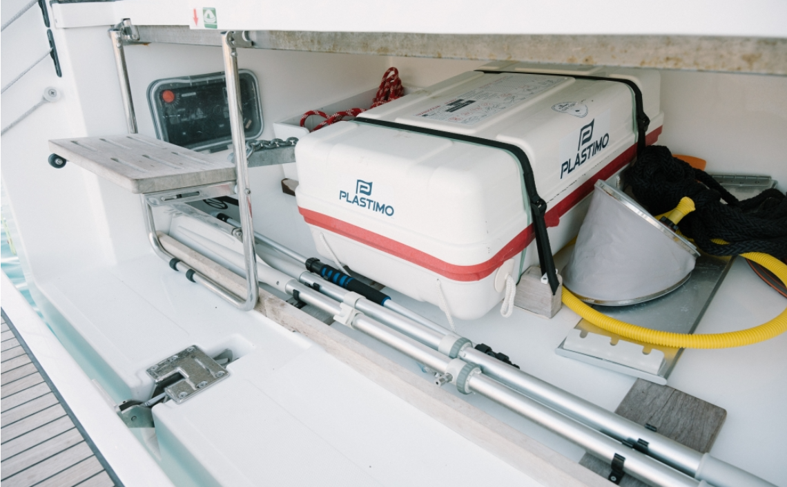 | Safety | Autopilot, Blitzboje, Bootsmannstuhl, Bordapotheke, Bordwerkzeug, Bugstrahlruder, elektr. Bilgepumpe, Feststoffschwimmwesten, Feuerlöscher, Flaggen, Handbilgepumpe, Kinderschwimmwesten, Lifebelts, Löschdecke, Markierungsboje, Motor-Ersatzteile, Nebelhorn, Notpinne, Notsignale, Radarreflektor, Rettungsinsel, Suchscheinwerfer, Taschenlampe, UKW-Funk, Zweitanker |