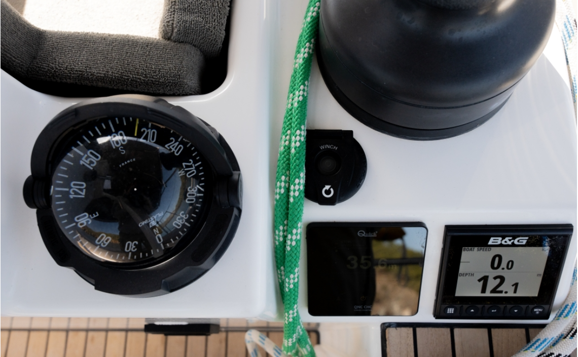 | Navigation | Barometer, Fernglas, GPS mit Kartenplotter im Cockpit, Hafenhandbücher, Handpeilkompass, Kompass, Seekarten, Tridata (Log, Echolot, Windm.), Windmesser |