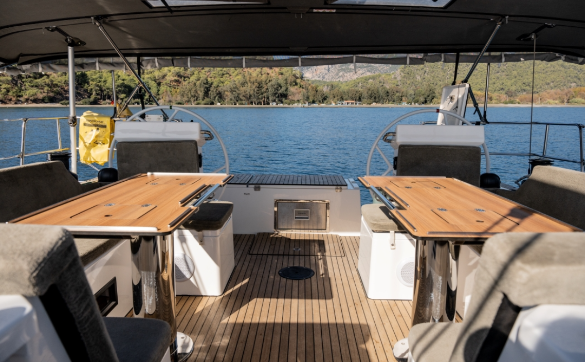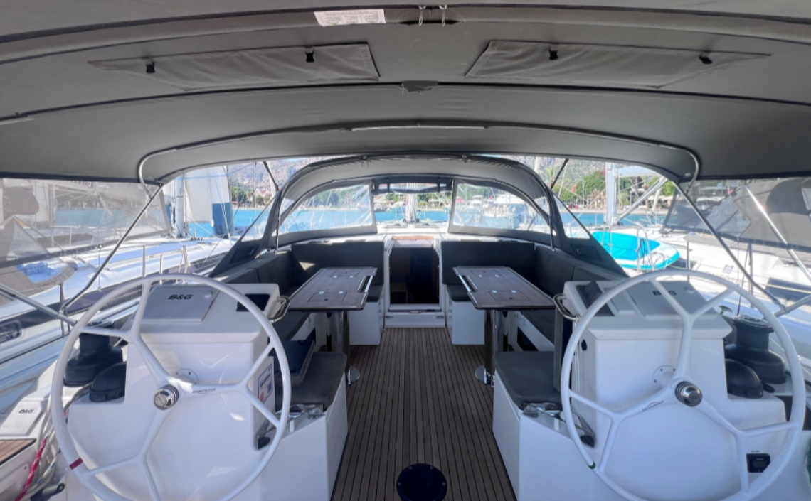 | Outside | 12 V-Anschluss, Anker mit Kette, Badeleiter, Biminitop, Bootshaken, Cockpitdusche, Cockpitlautsprecher, Cockpitleuchte, Cockpitpolster, Cockpittisch, Deckbürste, Dieselkanister , elektr. Ankerwinsch, Fender, Festmacherleinen, Gangway, Kugelfender, Kunststoff-Eimer (Pütz), Schnorchelausrüstung, Solaranlage, Sprayhood, Teak im Cockpit, Wantenschneider, Wasserkanister , Windex, Winschen |